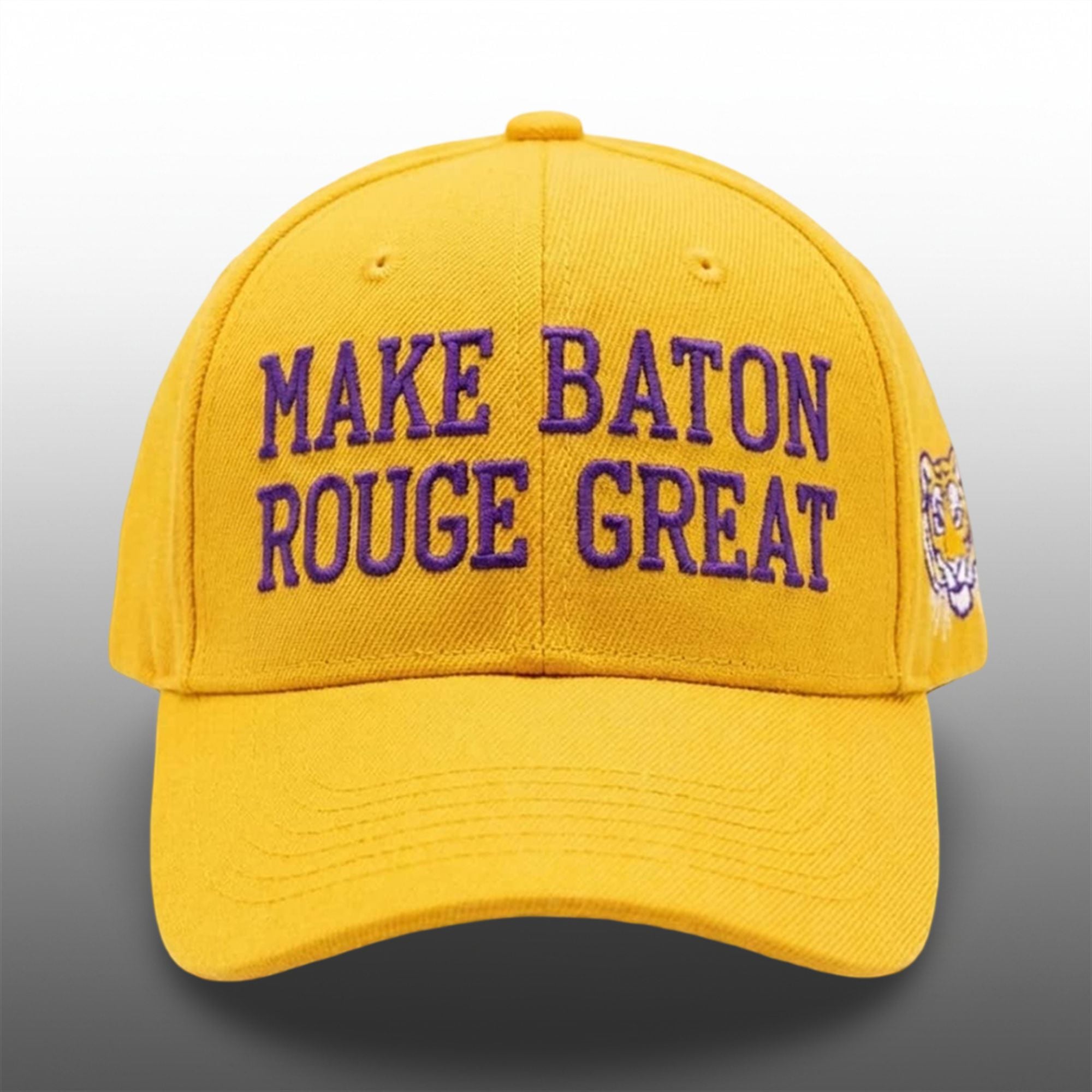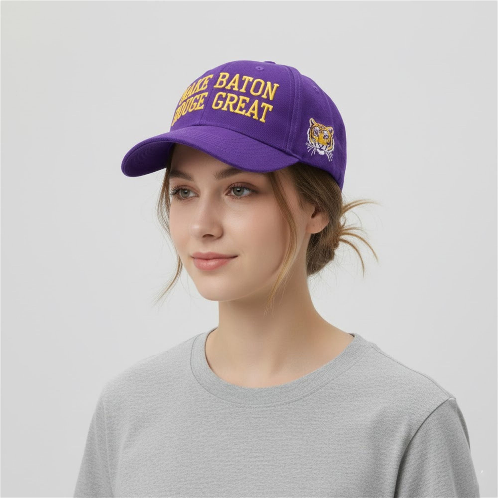The hat is a visual manifesto for the future of LSU football. The design is a masterclass in bold simplicity, utilizing the classic “political slogan” font to deliver a message “Make Baton Rouge Great” that resonates deeply with a fanbase hungry for wins. The deep purple base provides a stark, high-contrast background for the vibrant gold text, ensuring the message is legible from across the stadium.
