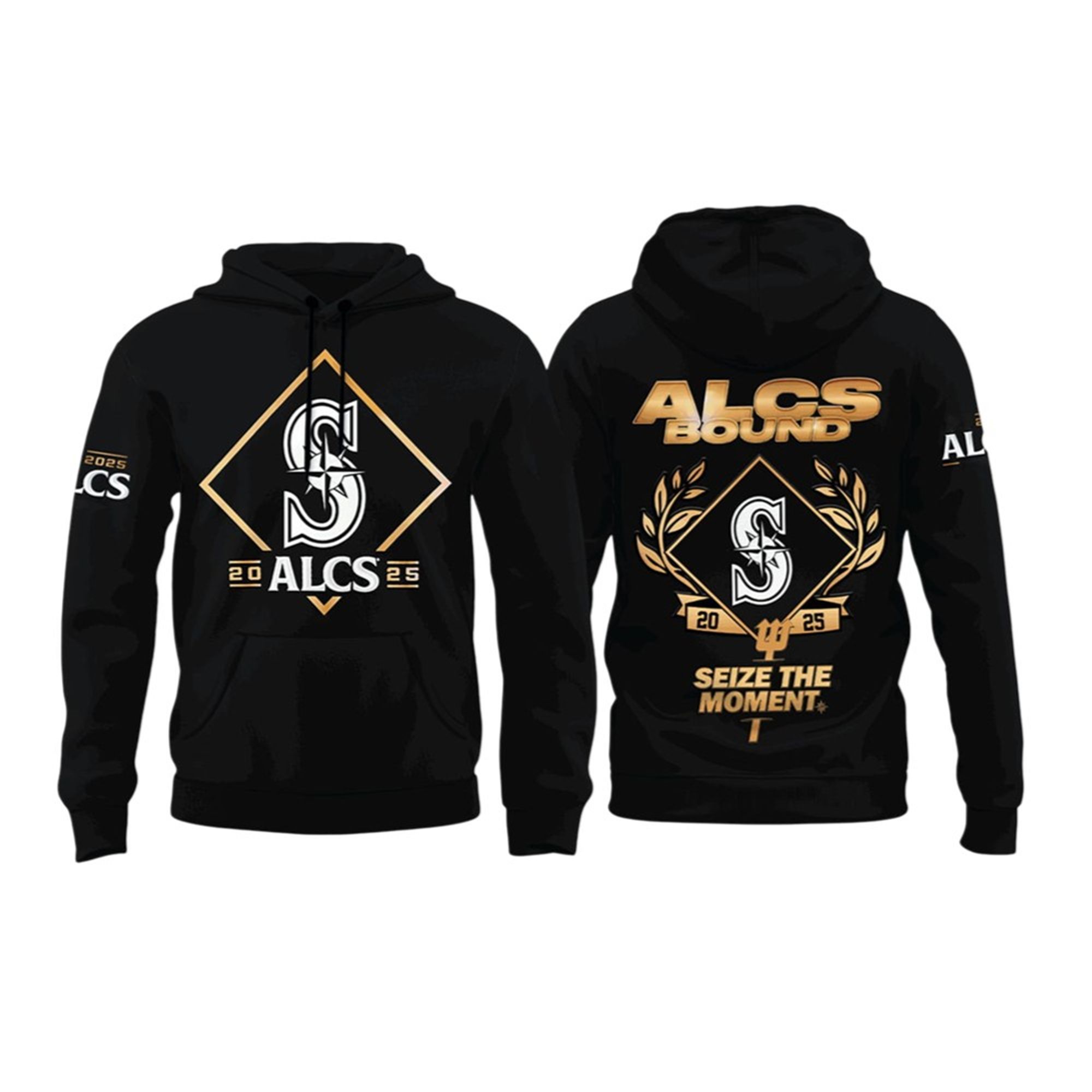 The back of the hoodie amplifies the celebration, featuring a bold “ALCS BOUND” declaration in commanding gold lettering above the primary logo, now framed by triumphant laurel wreaths—an ancient symbol of victory. Below it all, the inspirational mantra, “SEIZE THE MOMENT,” serves as a powerful reminder of the team’s postseason philosophy. With additional “ALCS” graphics on the sleeves, your pride will be on full display from every angle. This is the definitive way to commemorate the unforgettable plays, the nail-biting wins, and the unyielding spirit that defined the 2025 Mariners.