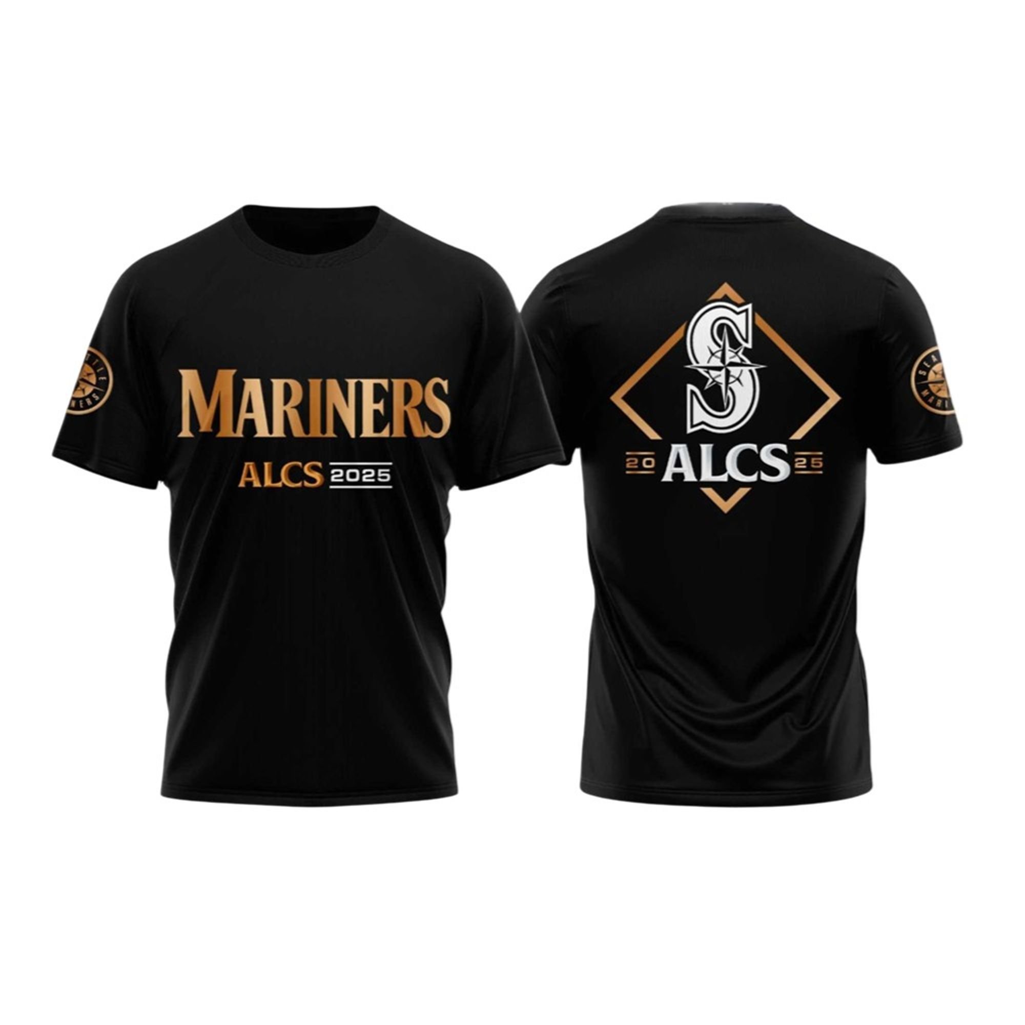 Capture the euphoria of the pennant-clinching moment with a t-shirt that speaks volumes. The front of this black shirt features the word “MARINERS” in a stunning, metallic gold script that shines with the glory of victory. Directly below, “ALCS 2025” is proudly displayed, marking the year that will forever be etched in franchise lore. The design is bold, sophisticated, and instantly recognizable as a champion’s garb. On the back, a striking diamond-shaped emblem frames the iconic Mariners “S” compass logo, flanked by the year “20” and “25,” with “ALCS” prominently featured below. This dual-sided design ensures your pride is visible from every angle, whether you’re celebrating at a parade, at T-Mobile Park, or with fellow fans across the country.