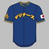 This meticulously crafted jersey captures the essence of the celebration with unique design elements. Presented in a striking navy blue, the jersey features contrasting vibrant yellow/gold trim on the collar and sleeve cuffs, adding a pop of energy. The front proudly displays “Mariners” written in Japanese Katakana script (マリナーズ), immediately signaling its special purpose.