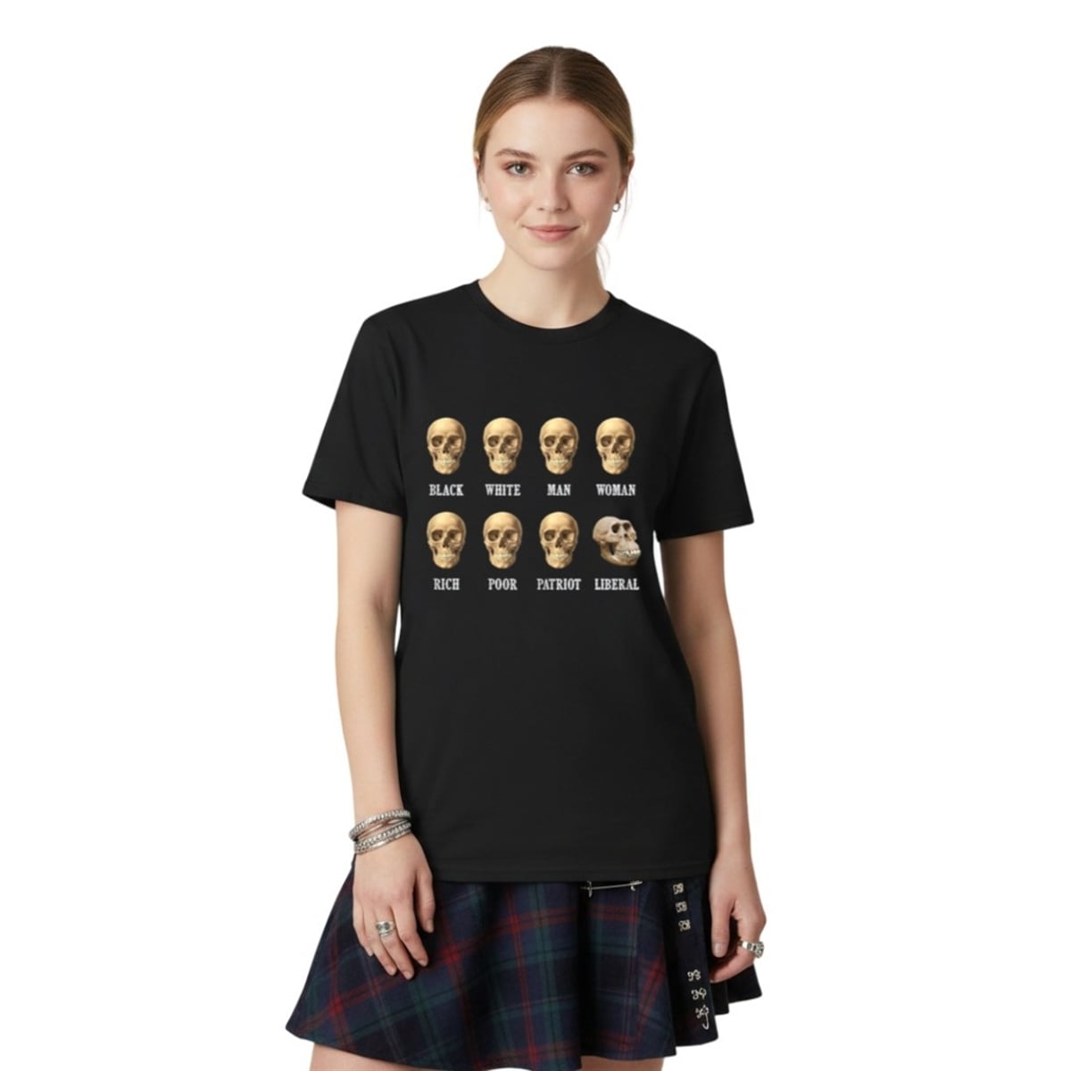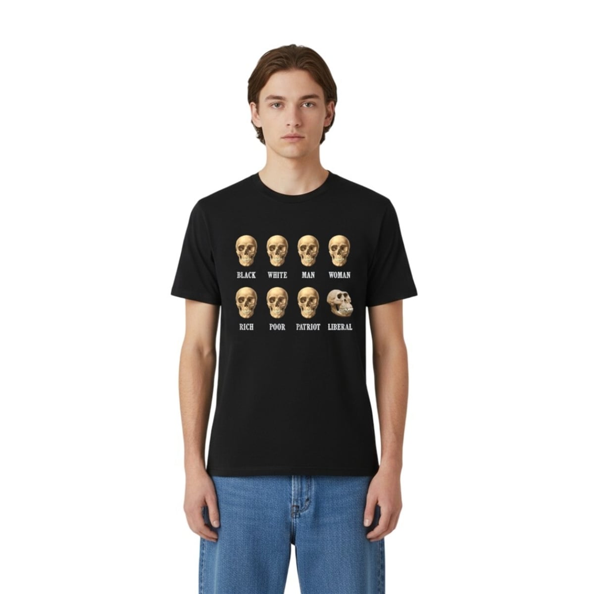This shirt features a highly distinct and structured visual graphic that has become legendary in online meme communities. The front of the item displays a grid of eight distinct skulls, arranged in two neat rows. The first seven skulls are anatomically identical human skulls, each labeled with different identifiers: “BLACK,” “WHITE,” “MAN,” “WOMAN,” “RICH,” “POOR,” and “PATRIOT.” The visual pattern establishes a rhythm of unity, which is abruptly and intentionally broken by the final image. The eighth skull, labeled “LIBERAL,” features the skeletal structure of a primitive, prehistoric ape. The stark contrast between the first seven images and the final punchline creates an immediate, highly visual joke that requires no further explanation.