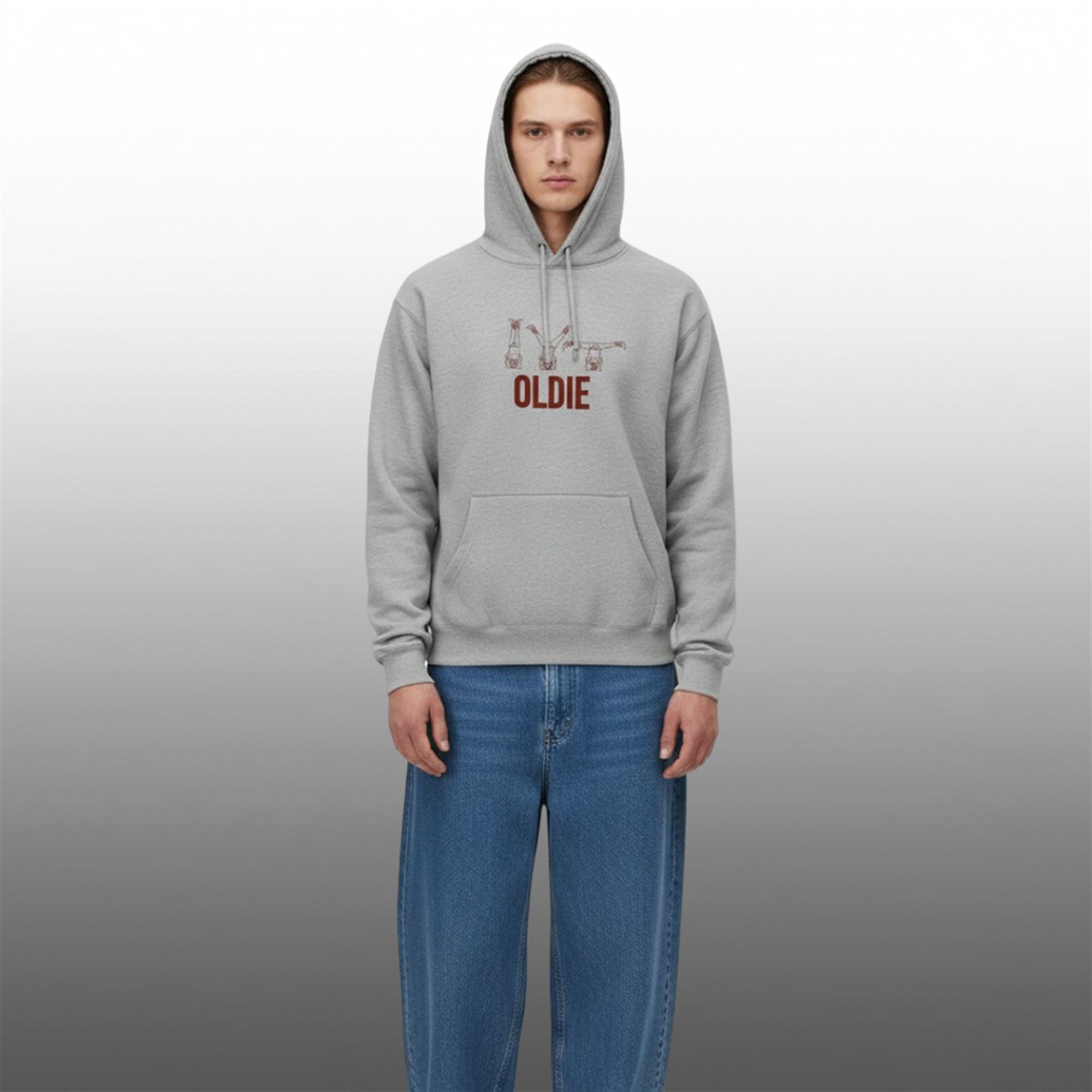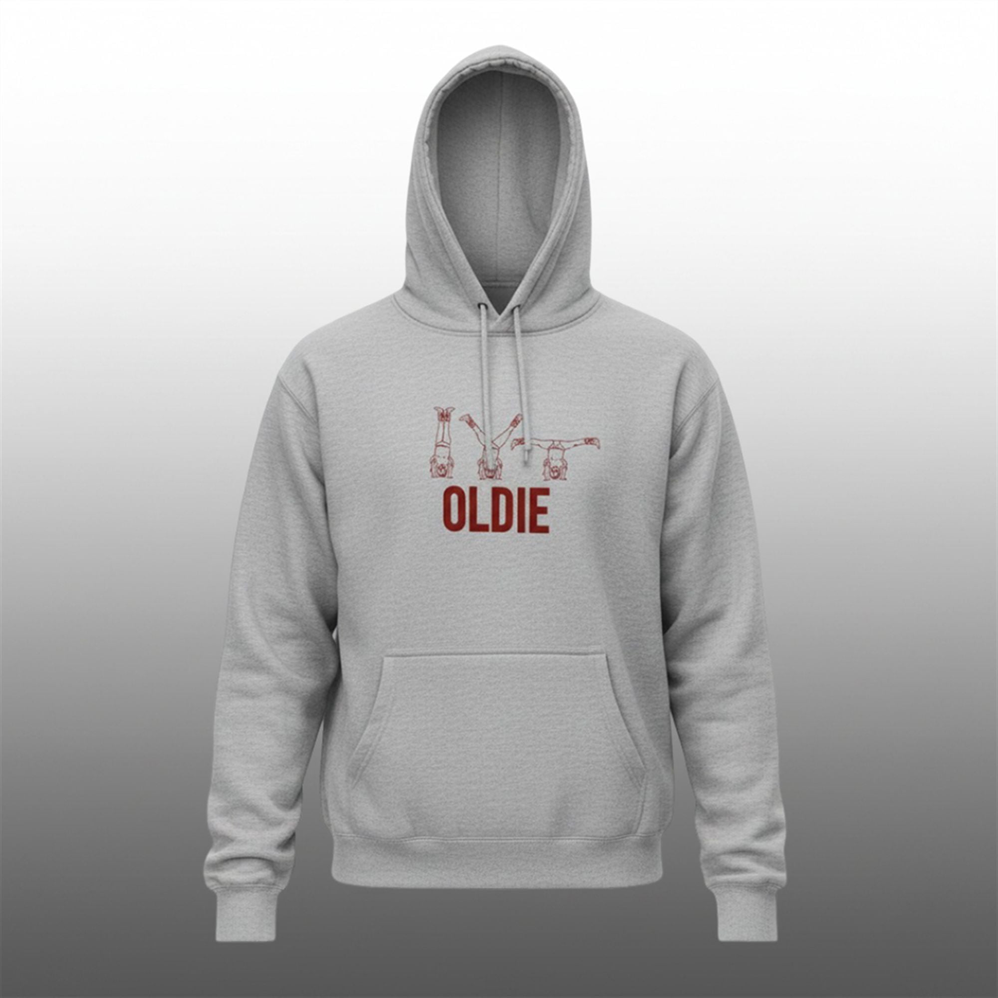 This isn’t just a standard sweatshirt; it’s a statement piece that balances humor with vintage collegiate vibes. The design features a premium heather grey backdrop, serving as the perfect canvas for the bold, burgundy-red “OLDIE” text. Above the typography, a trio of hand-drawn acrobatic figures—executed in a minimalist, sketch-style—add a layer of artistic intrigue and playfulness. It’s the exact kind of obscure, high-character gear that pro athletes love to rock on the road.