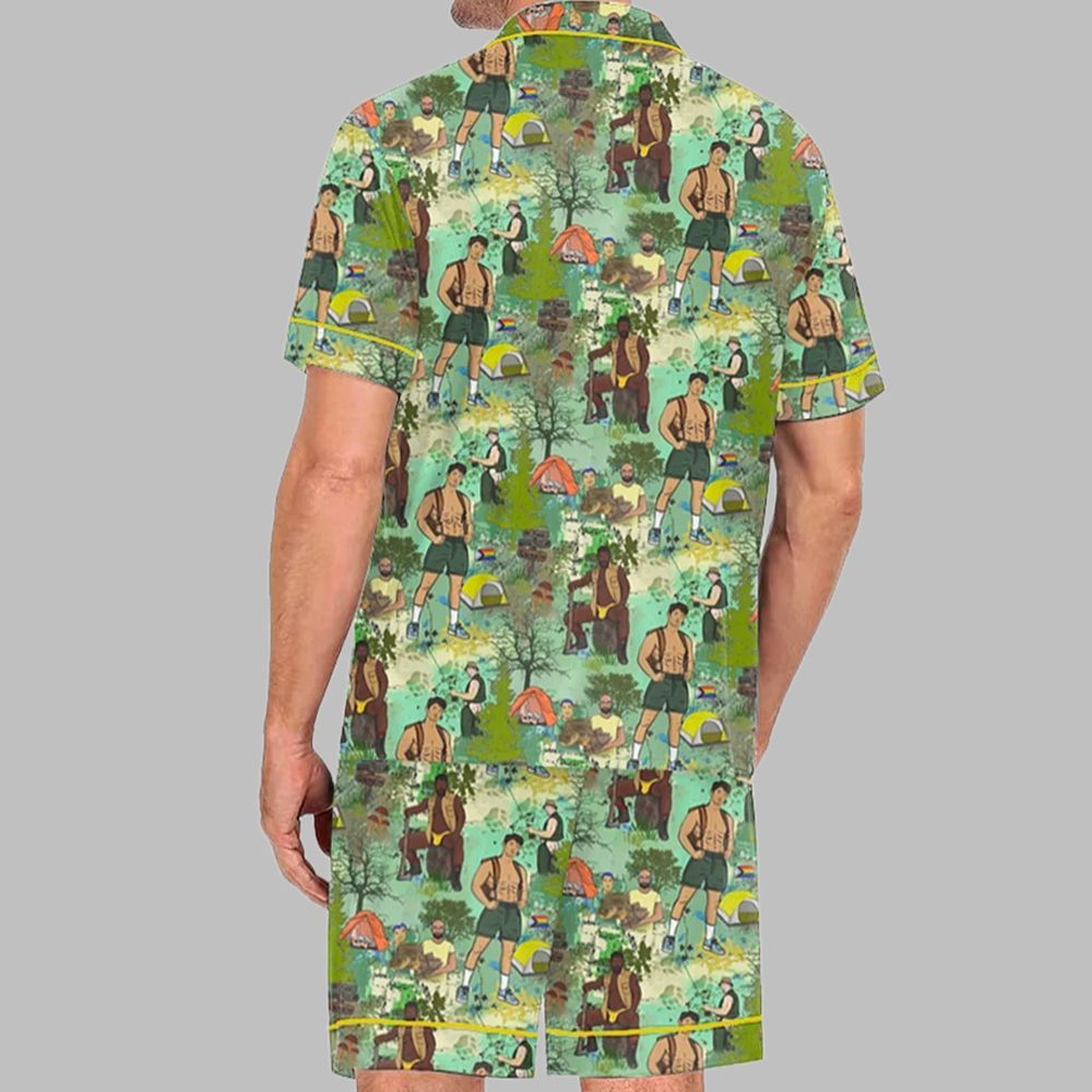 What truly sets this Men’s Bear Camp Pride Month Love Is Love Print Pajama Set apart is its exclusive, custom-designed print. Immerse yourself in a playful “Bear Camp” scene, bustling with illustrated characters enjoying nature, featuring tents, trees, and friendly bears. This lively pattern subtly yet powerfully incorporates the “Love Is Love” ethos, celebrating diversity and acceptance within the LGBTQ+ community, particularly nodding to the beloved bear subculture. The vibrant colors pop against the soft green background, while contrast piping adds a refined finishing touch to the collar, cuffs, and pocket edges, elevating the overall look from simple PJs to stylish loungewear.