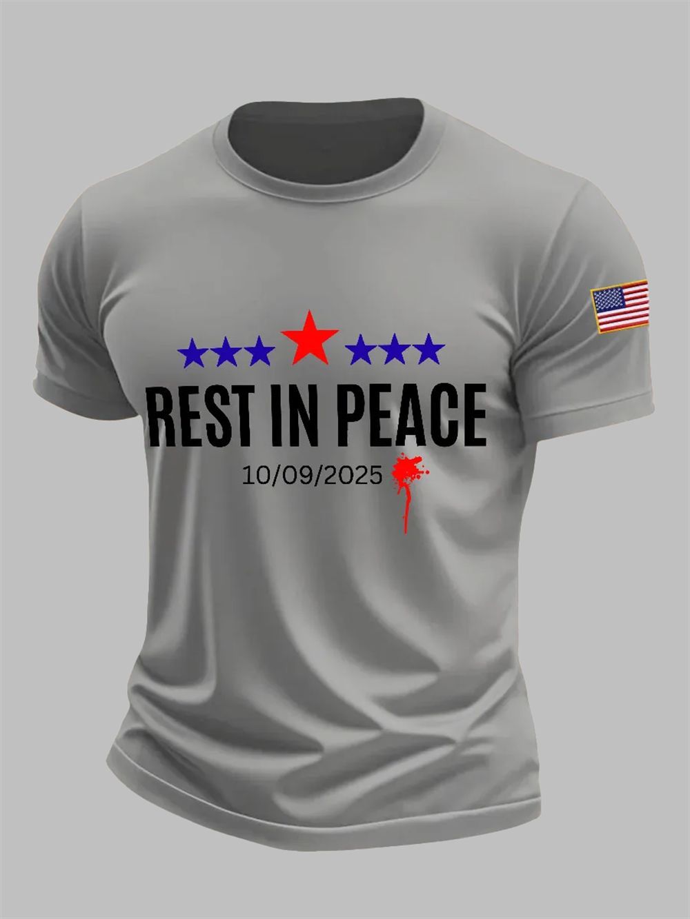 The front of the shirt features a bold, impactful design with the words “REST IN PEACE” in a stark, white font, set against a deep red fabric. Below, the date “10/09/2025” is printed, forever marking the day of the tragic event. A subtle yet poignant blood-splatter graphic adds a layer of raw emotion and realism to the design. The five stars above the text, three blue and one red, are open to interpretation, inviting reflection on patriotism, sacrifice, and the political climate of our times. An American flag patch on the sleeve completes the look, grounding the design in a distinctly American context.