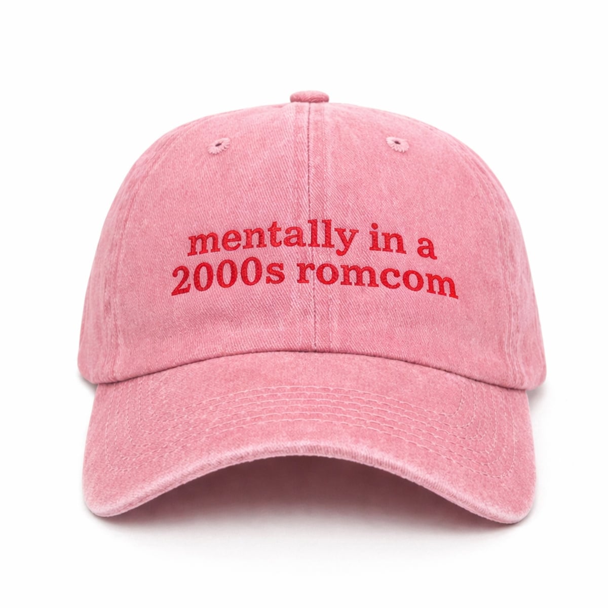 Step into your main character era with the ultimate accessory for early-aughts nostalgia. The Mentally In A 2000s Romcom Hat is a vibrant, stylish nod to the golden age of cinematic meet-cutes and iconic pop-culture moments. Designed with a striking visual contrast of soft pink and bold red lettering, this visually appealing dad cap is more than just a headwear choice; it is a full-blown mood.