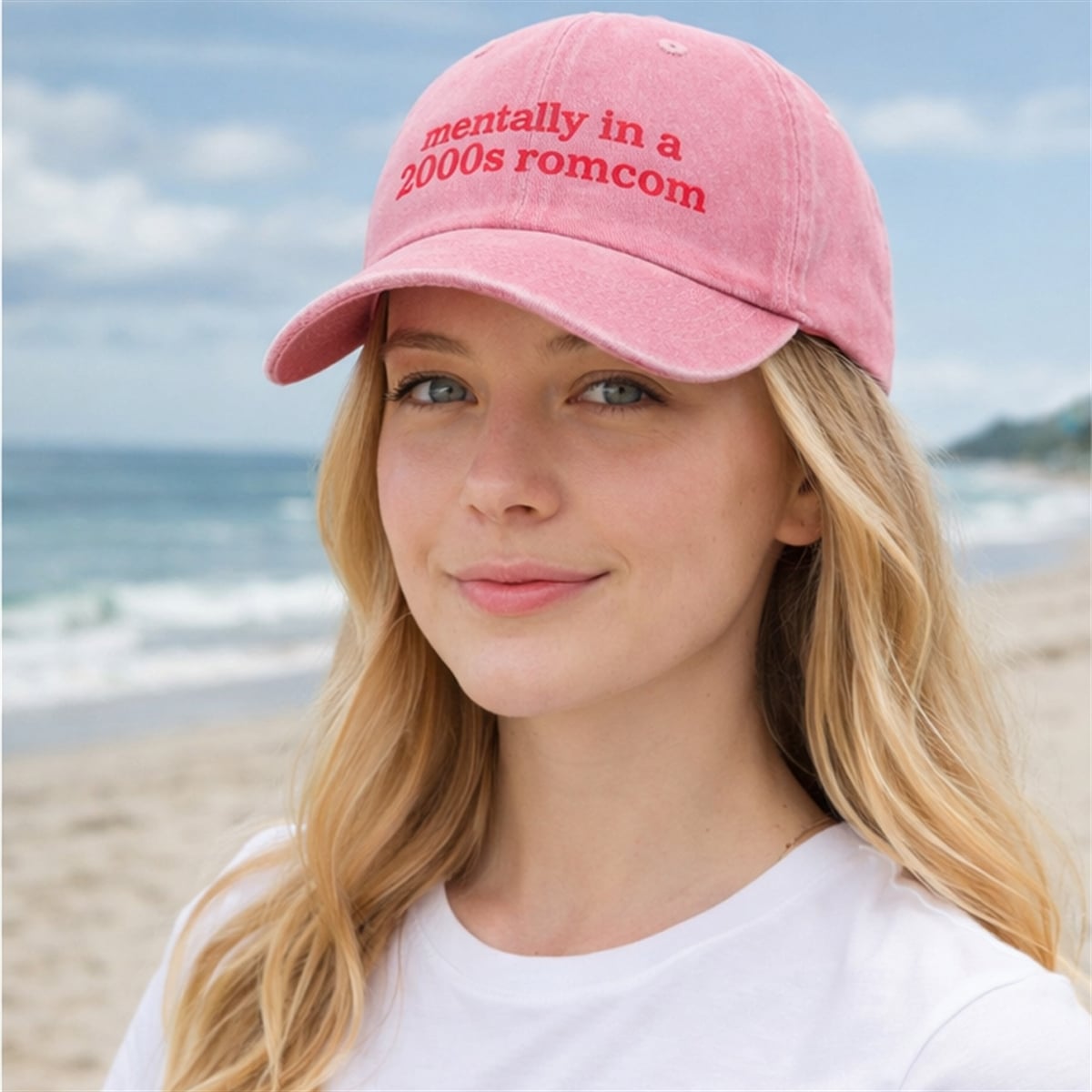 The hat is a masterclass in modern nostalgic styling. Featuring a classic, relaxed dad-hat silhouette, it effortlessly blends a vintage visual aesthetic with contemporary internet culture, with text line “Mentally In A 2000s Romcom”. The base of the hat features a beautifully muted, washed pink tone that serves as the perfect canvas for the vibrant, attention-grabbing red typography across the front panels.