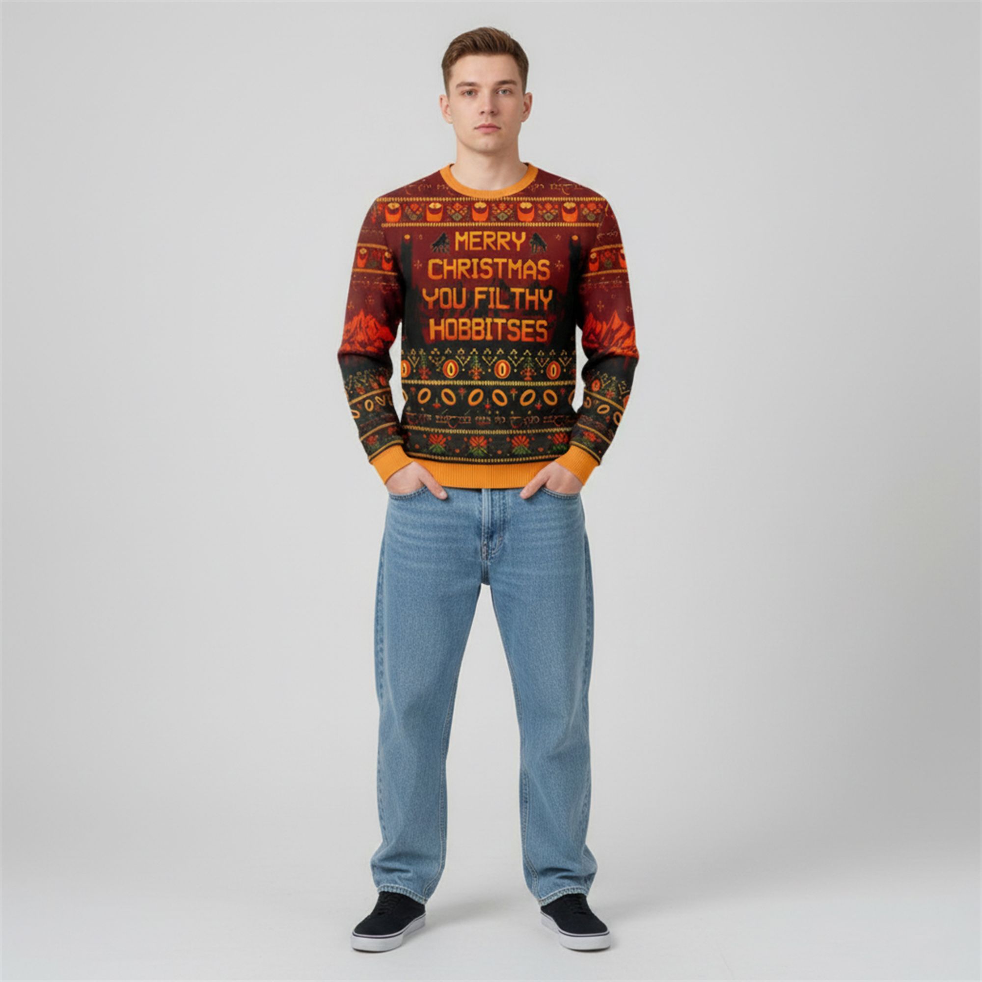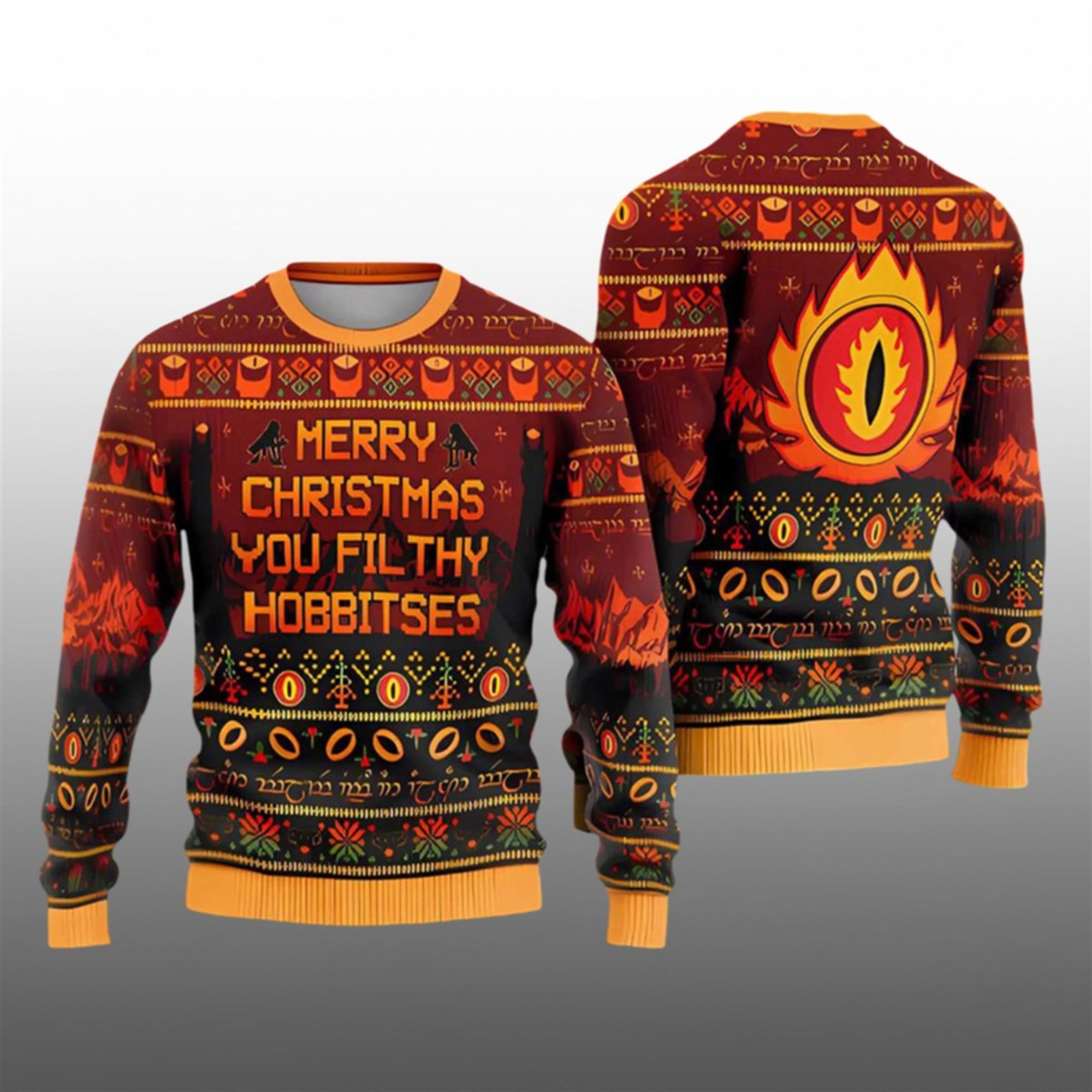 Visually, the sweater utilizes a rich, fiery color palette of deep maroons, burnt oranges, and volcanic yellows, mimicking the fires of Mount Doom. The front features the hilarious slogan in a retro, pixelated font that mimics traditional knitting, flanked by the dark towers of Mordor. The back is dominated by a massive, flaming Eye of Sauron, ensuring that you are being watched—and admired—from every angle. The phrase “Merry Christmas You Filthy Hobbitses” cleverly twists the classic Home Alone line with Gollum’s distinctive speech pattern.