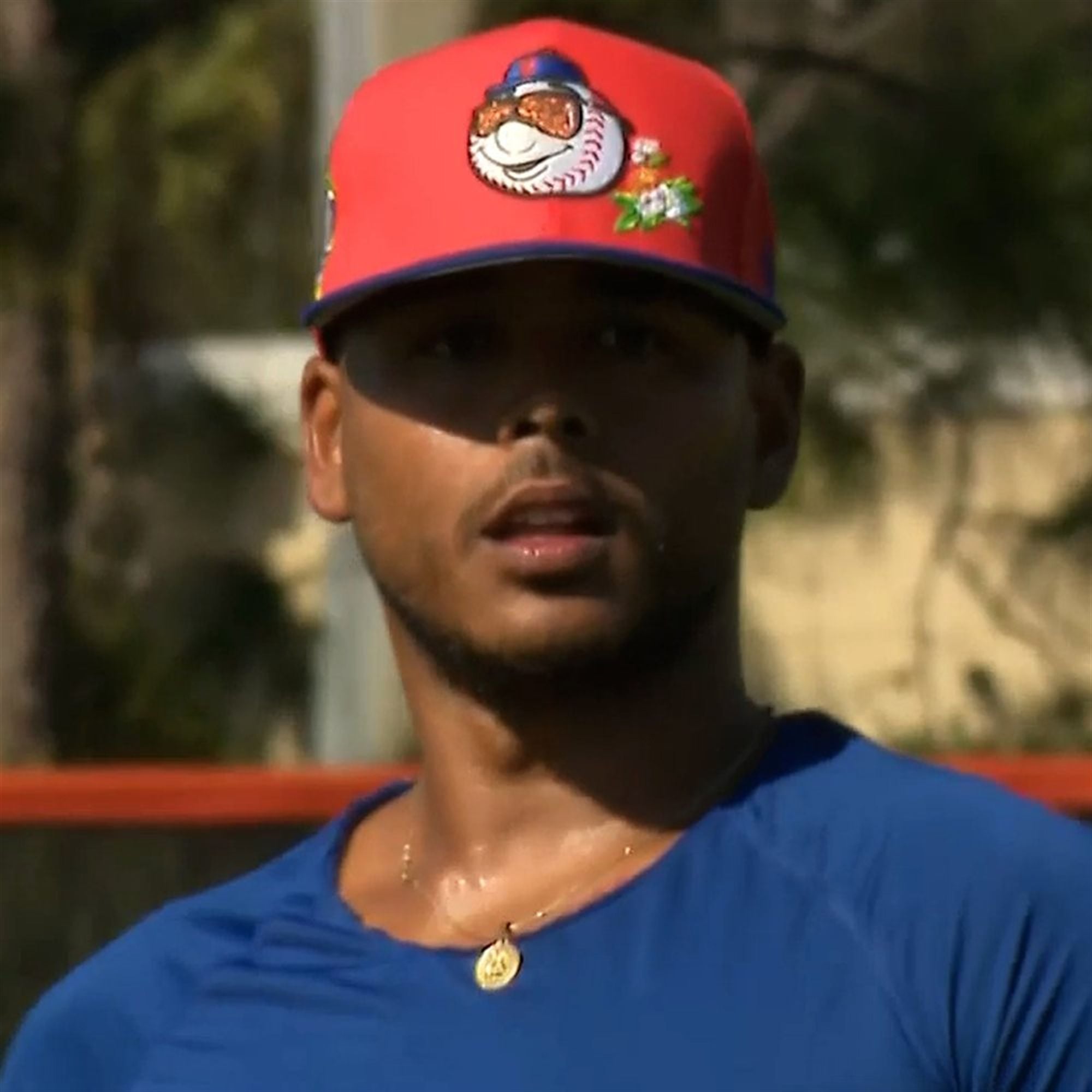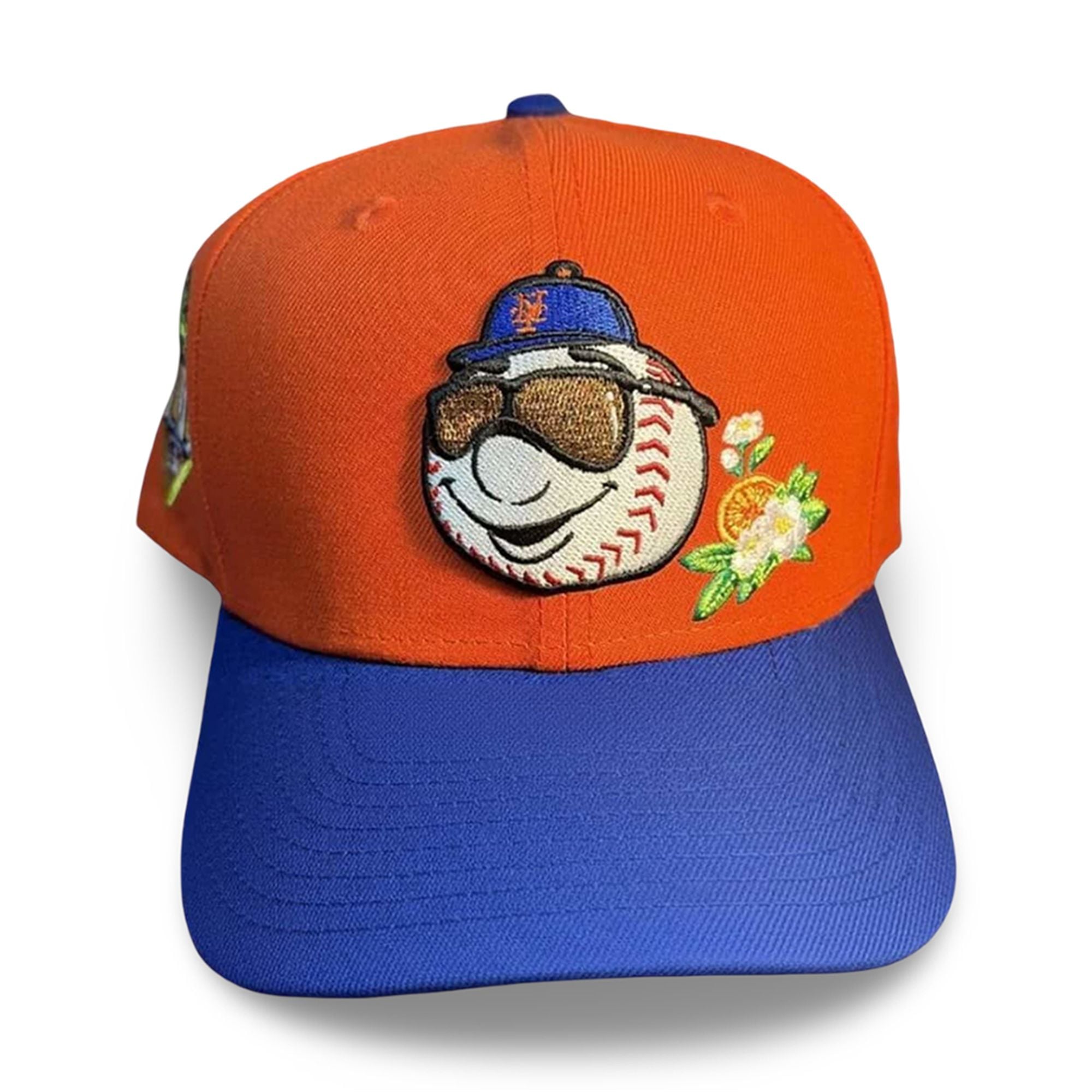 The crown features a striking, electric orange base—a nod to the team’s secondary color that often takes a backseat to blue. The centerpiece is a anthropomorphic baseball mascot (a stylized “Vacation Mr. Met”) rocking aviator sunglasses and his own miniature blue cap. Flanking the mascot are delicate orange blossoms, the state flower of Florida, adding a localized botanical touch that ties the team to its Port St. Lucie spring home.