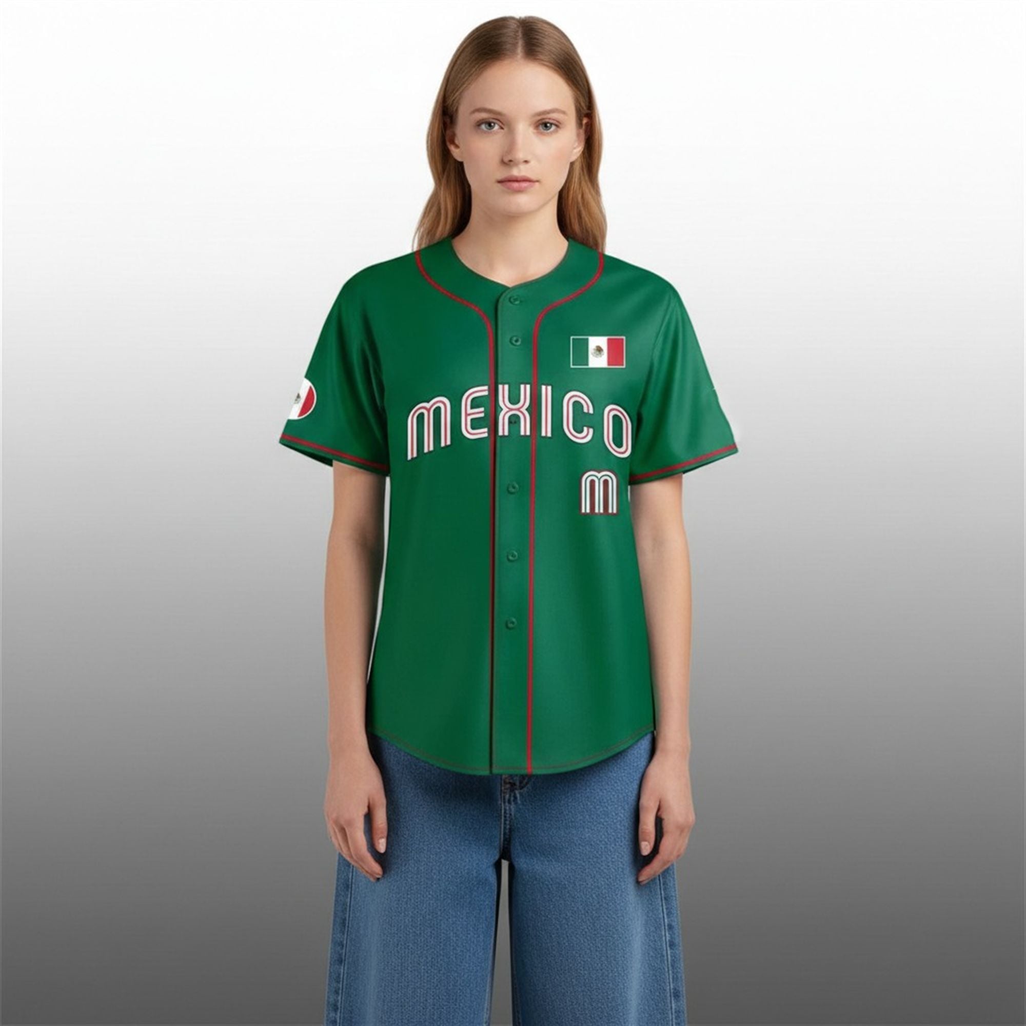 Every visual detail has been considered to match the tournament’s high standards. The jersey features a clean button-down front accented by vibrant red piping that traces the placket and sleeve cuffs. The left sleeve displays the Mexico flag patch, while the right sleeve showcases the team’s crest. On the back, the customization options allow for a personal touch, sitting just above the prominent “World Baseball Classic 2026” logo, which anchors the design in this specific moment of sports history.