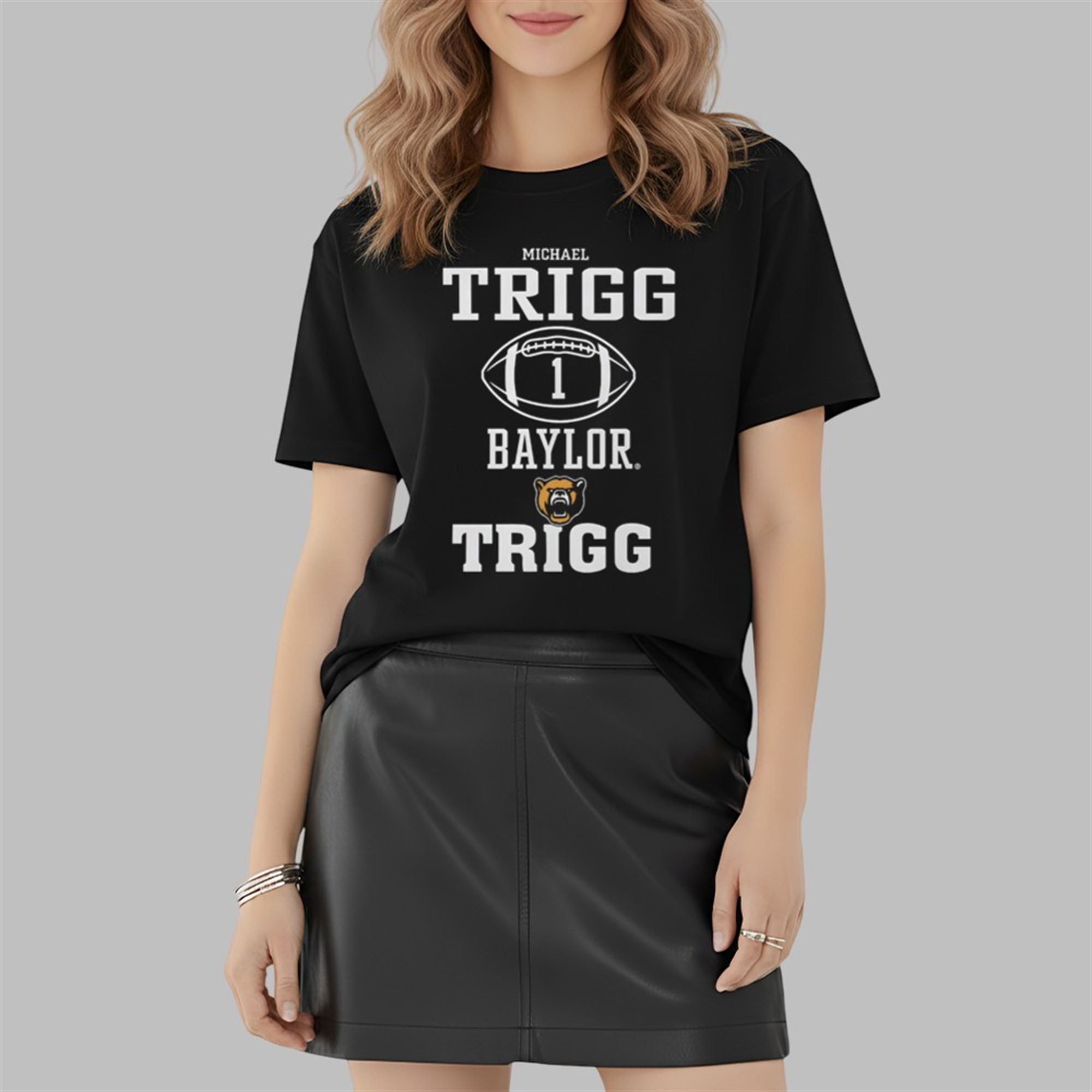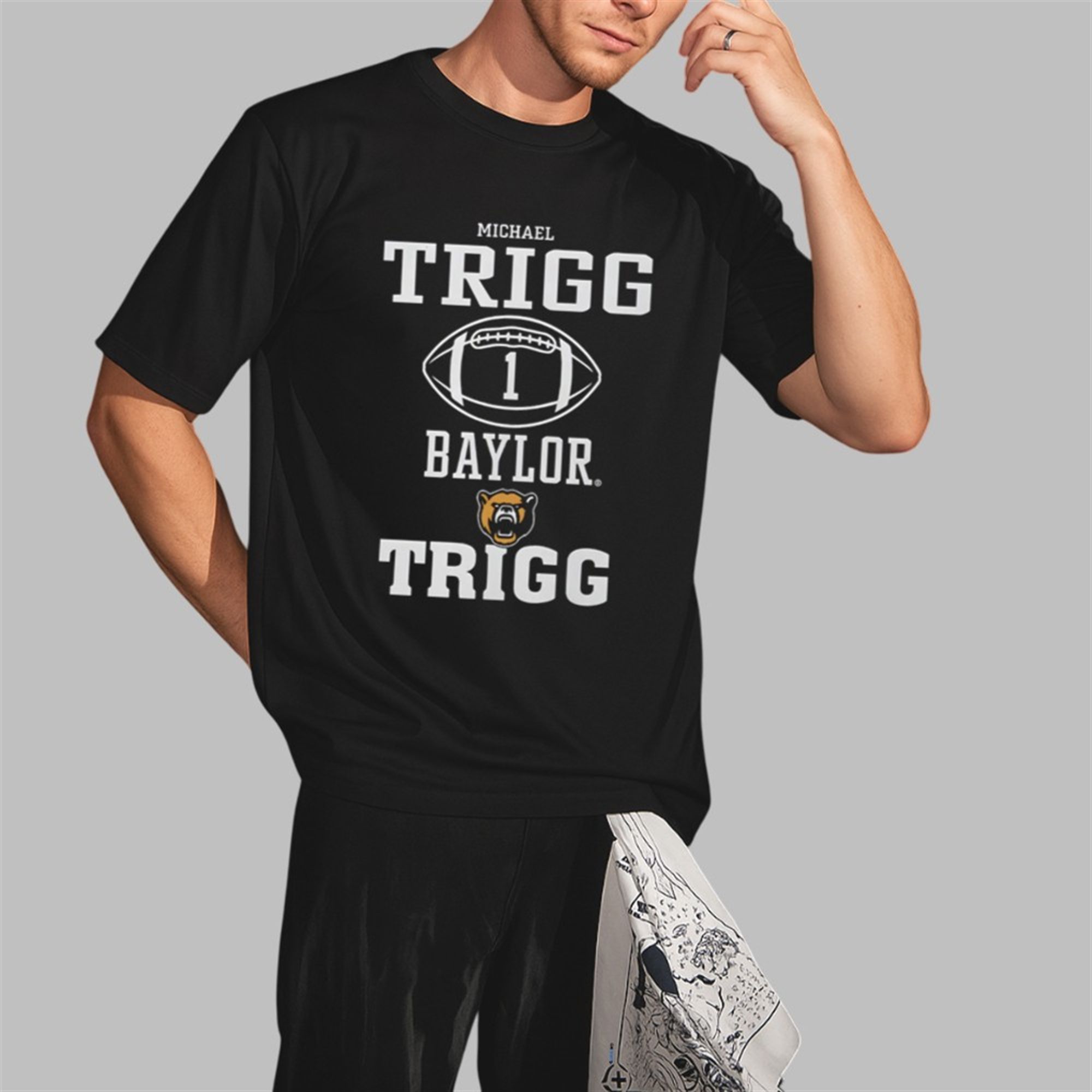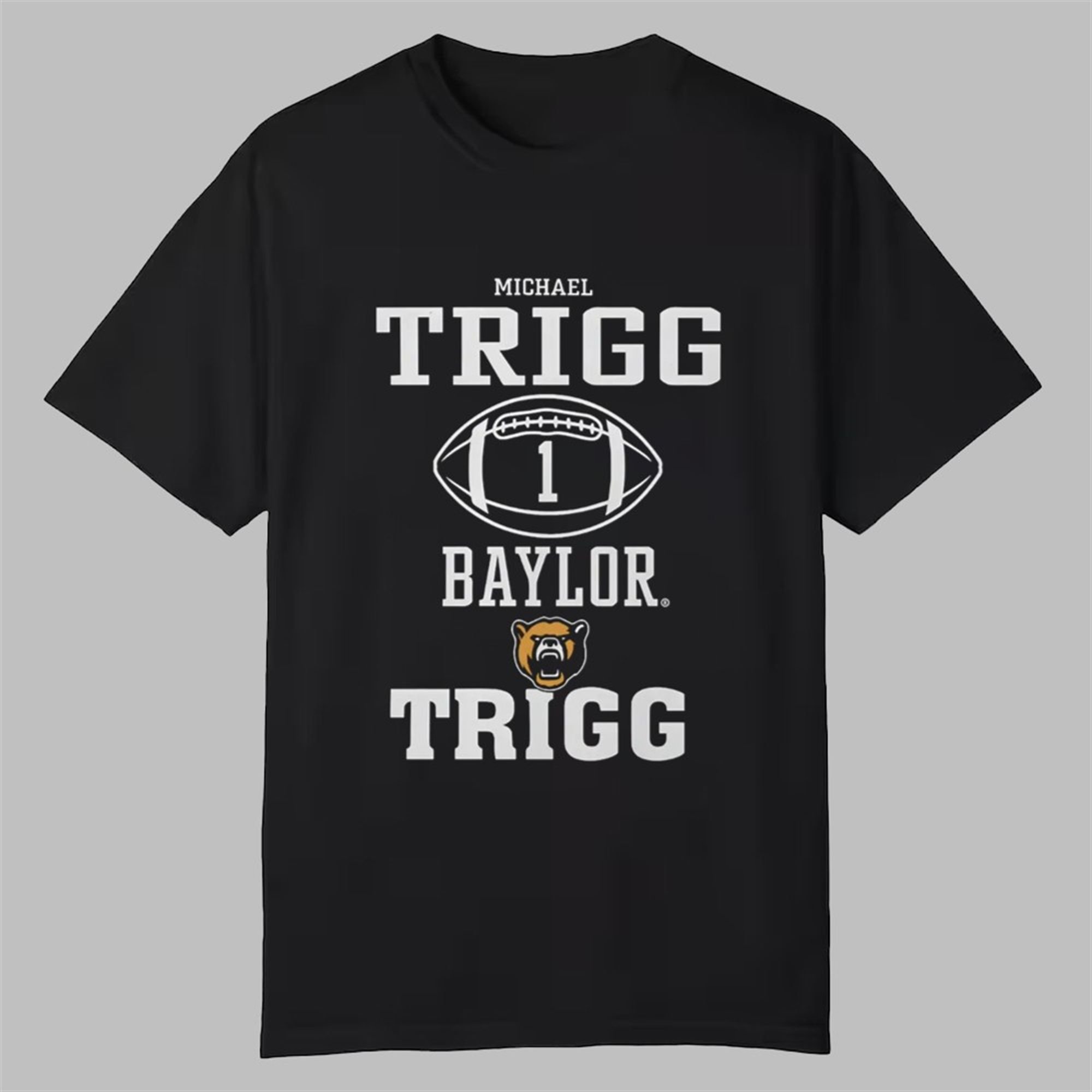 The design is bold, proud, and unmistakable. Printed in sharp, athletic-style white lettering on a classic black tee, the shirt features “MICHAEL TRIGG” and “BAYLOR” prominently. At its center is an iconic football graphic displaying his jersey number, “1”. Just below, the fierce, Baylor Bear logo makes it clear where your allegiance lies. This is the gear you wear when you want to “Sic ‘Em” with true fan passion.