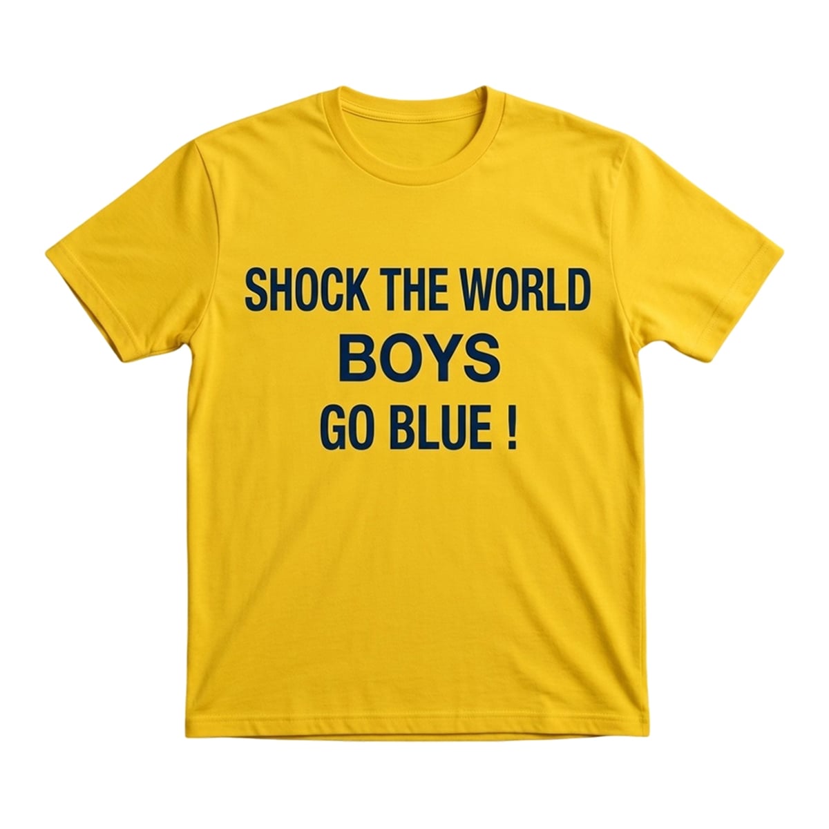 The phrase “Shock The World” is deeply woven into the fabric of competitive sports, reserved for moments when a team is underestimated yet poised to achieve greatness. When combined with “Boys Go Blue,” it transforms into a highly specific, emotional tribute to the Michigan Wolverines. It represents the unwavering belief that the team can topple giants, upset rankings, and deliver historic performances on the hardwood. Wearing this message is a nod to the resilience, strategic brilliance, and pure hustle that defines the team’s basketball program. It is an invitation to dream big and a reminder that true fans stand by their team, especially when the stakes are at their highest and the world is watching.