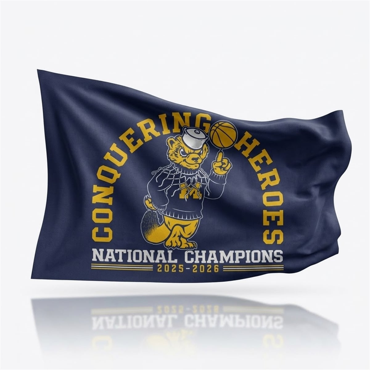 The flag is a powerful emblem of collegiate athletic supremacy. This piece features a deep navy blue background that makes the vibrant maize yellow lettering and graphics pop with visual intensity. Central to the design is a vintage-inspired wolverine mascot, clad in a classic Michigan Wolverines “M” sweater and sailor hat, effortlessly spinning a basketball on its finger. Arched triumphantly over the mascot are the words “CONQUERING HEROES,” with the definitive “NATIONAL CHAMPIONS 2025-2026” anchored firmly at the bottom. This layout is meticulously designed to evoke a sense of deep nostalgia while celebrating a completely modern, fresh victory. It is not just a standard piece of merchandise; it is a timestamp of greatness designed specifically for the modern era of college basketball fandom.