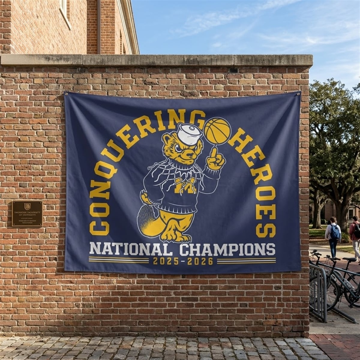 The visual elements of this championship flag carry deep, emotional significance for the Michigan faithful. The phrase “Conquering Heroes” is a direct, resonant pull from the iconic Michigan fight song, “The Victors,” instantly connecting with generations of fans and dedicated alumni. The inclusion of the fiercely confident wolverine mascot spinning the basketball symbolizes absolute on-court dominance, unshakeable confidence, and the undeniable swagger of a team that knew they were destined for the championship title. Furthermore, the clear 2025-2026 date stamp permanently immortalizes this specific squad’s journey, ensuring their unique legacy is never forgotten in the vast annals of sports history.