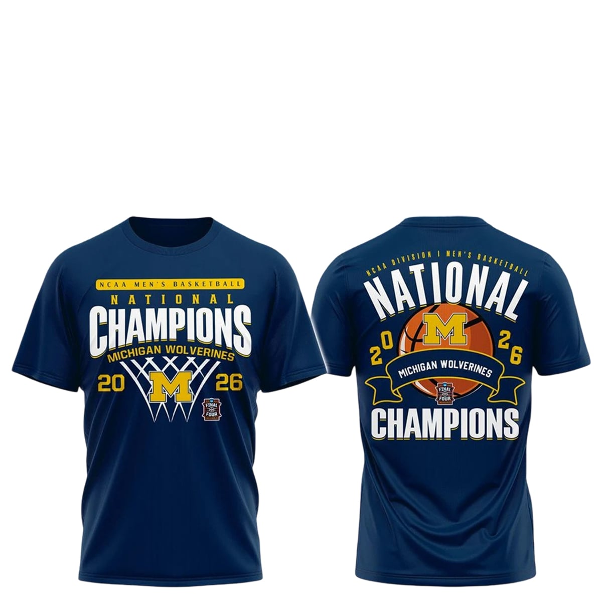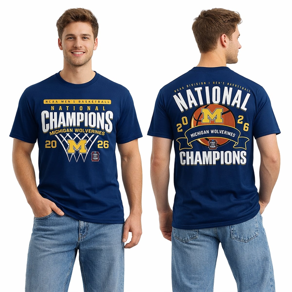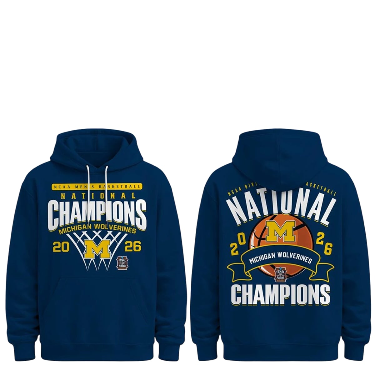 The visual architecture of this hoodie is a direct tribute to the team’s triumphant journey to the top of the basketball . The front proudly displays the bold words “NATIONAL CHAMPIONS” towering over a stylized basketball hoop, with the iconic maize block Michigan Wolverines ‘M‘ situated perfectly at the net. Flanked by the year “20” and “26“, it permanently anchors the wearer to this specific timeline of success. The back design expands on this narrative, featuring an oversized basketball graphic, sprawling banners declaring the team’s supreme status, and the Final Four insignia. Every graphic element is meticulously placed to reflect the prestige, teamwork, and ultimate glory of the Men’s Basketball tournament.