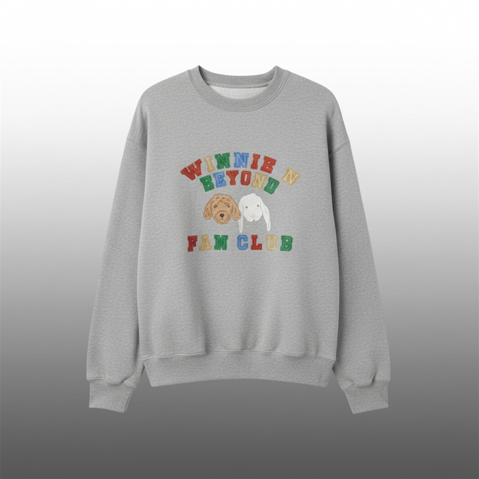 This grey crewneck features a nostalgic, 90s-inspired graphic with colorful chenille-style block lettering that reads “WINNIE N BEYOND FAN CLUB.” Centered beneath the text are the true stars of the show: a detailed embroidery-style print of Winnie the Poodle (the brown curly-haired diva herself) alongside her adorable white floppy-eared sibling. Whether you’re streaming the final season of Stranger Things, walking your own furry friends, or just scrolling through the latest viral “Winnie vs. Baby” memes, this sweatshirt is the ultimate cozy staple for the 2025 holiday season.