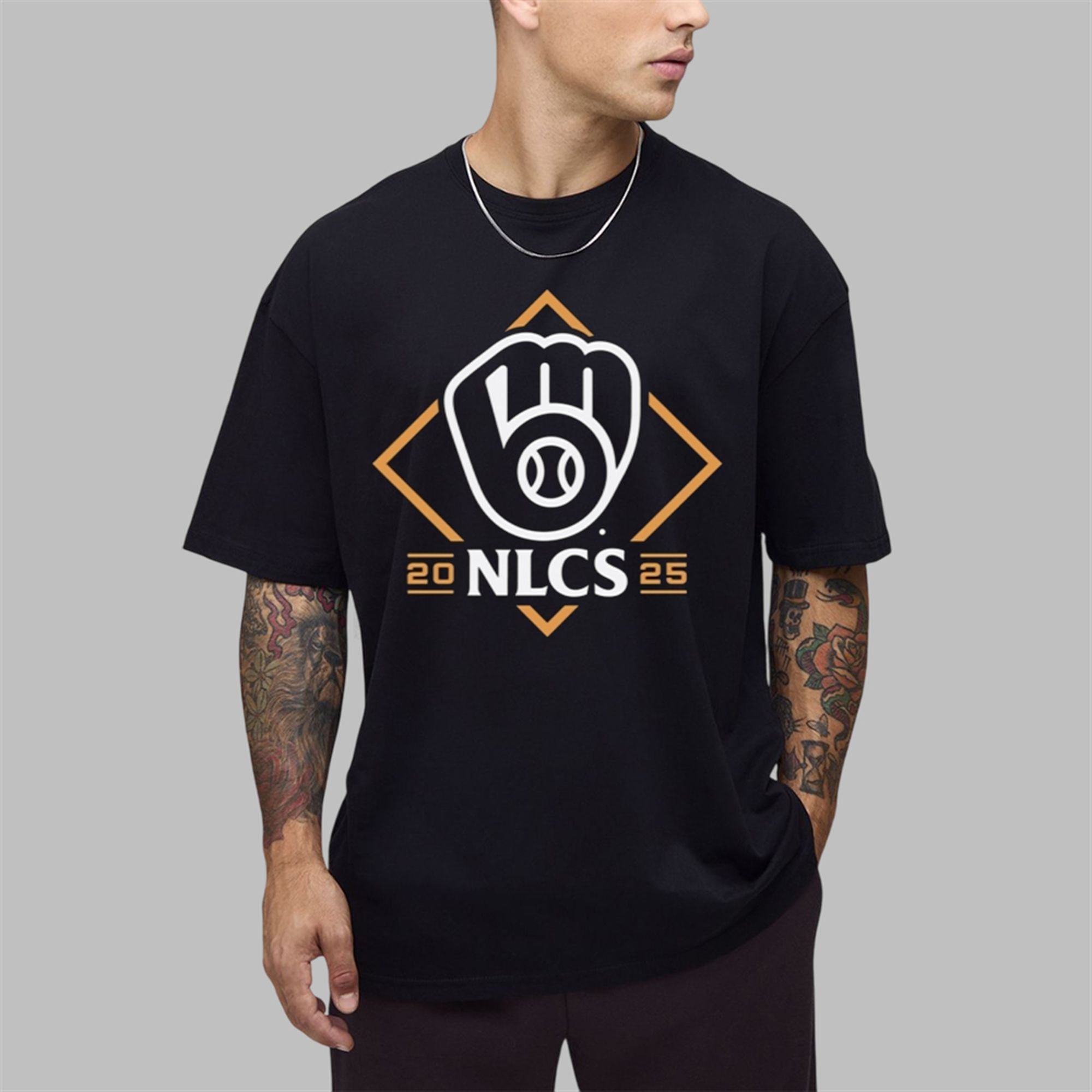 The design of this exclusive shirt tells a powerful story. The front proudly displays the iconic Brewers ball-in-glove logo, enshrined within a modern, golden diamond—a symbol of the baseball diamond where this team has battled all season long. Boldly featured is the “20 NLCS 25” text, cementing this garment as a timeless memento of this incredible achievement.