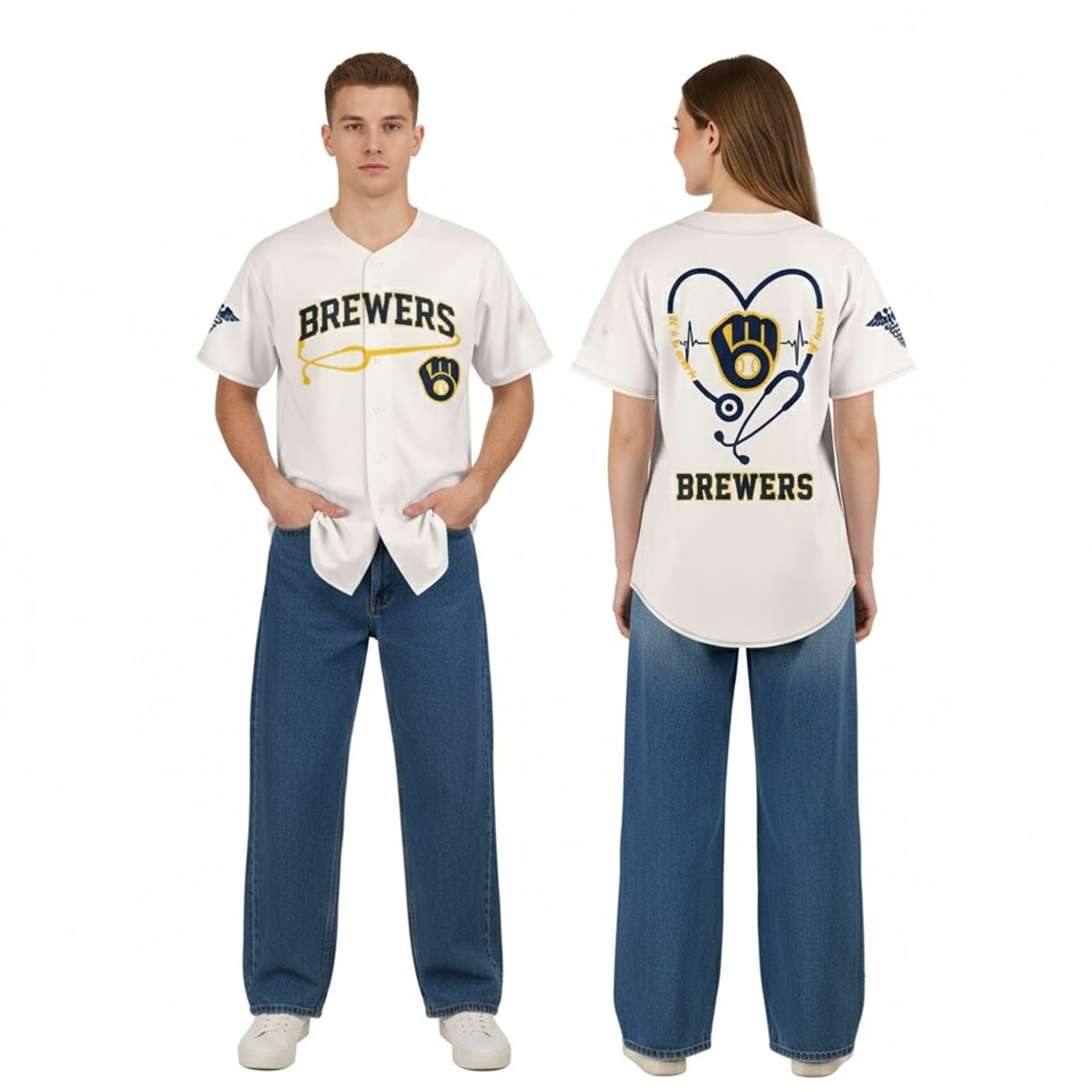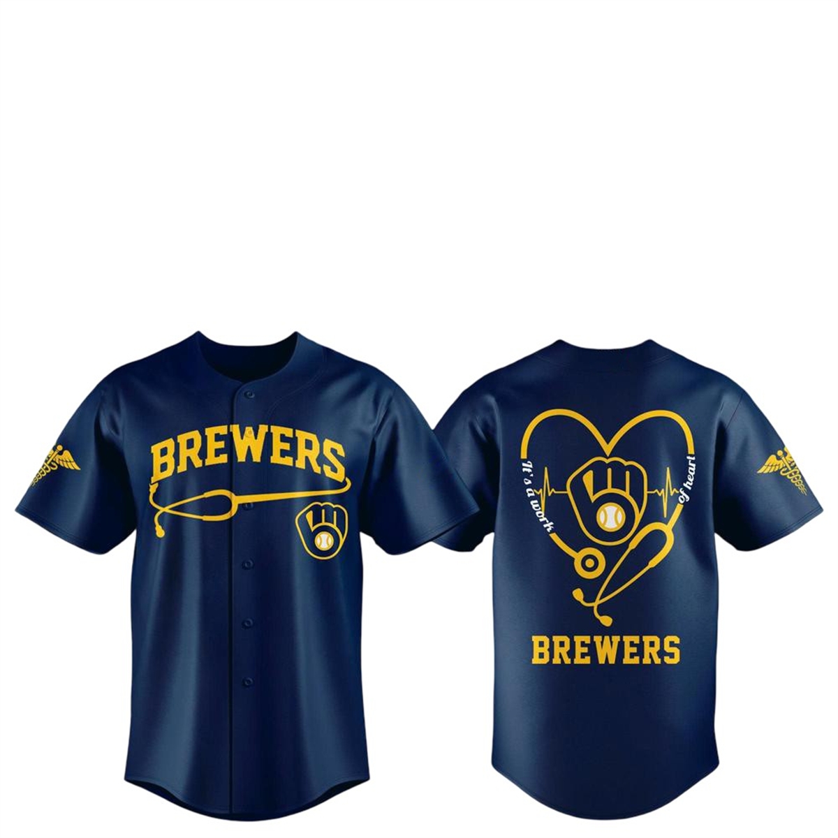 Turning the jersey around reveals the true centerpiece: a large navy stethoscope shaped like a heart, complete with an active EKG pulse line running through the center. Cradled within this medical heart is the iconic Brewers logo, flanked by the touching phrase, “It’s a work of heart.” To complete the aesthetic, the sleeves are adorned with the traditional Caduceus medical symbol, ensuring that every angle of this item resonates with its intended theme.