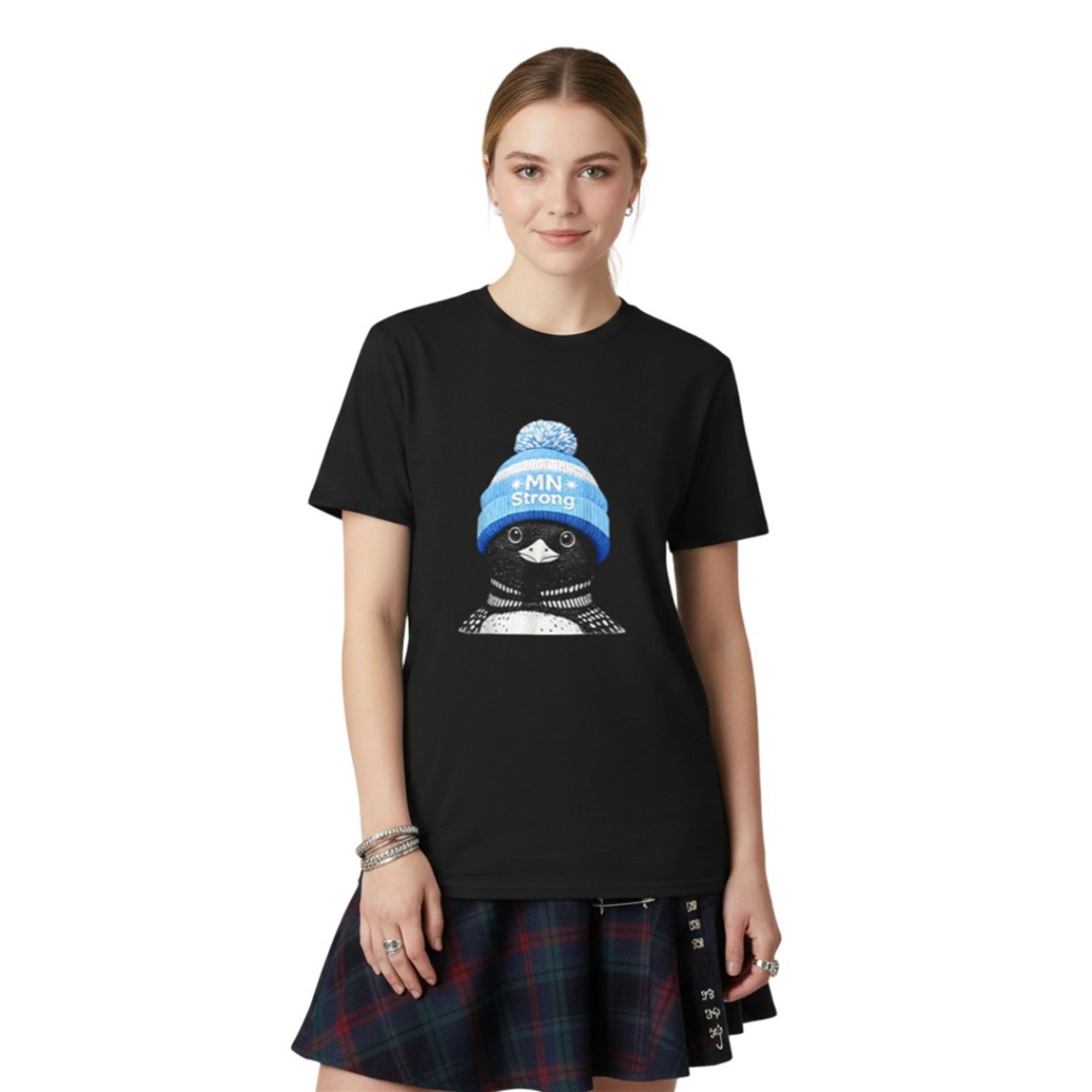 The shirt is a striking piece of visual storytelling that merges state pride with a contemporary moment of historical significance. At the center of the design is a hyper-realistic illustration of the Common Loon—Minnesota’s state bird—staring boldly forward. The loon is dressed for the harsh midwestern winter, wrapped in a cozy, dark knit scarf and wearing the focal point of the piece: a bright light blue pom-pom beanie emblazoned with the text “MN Strong.”