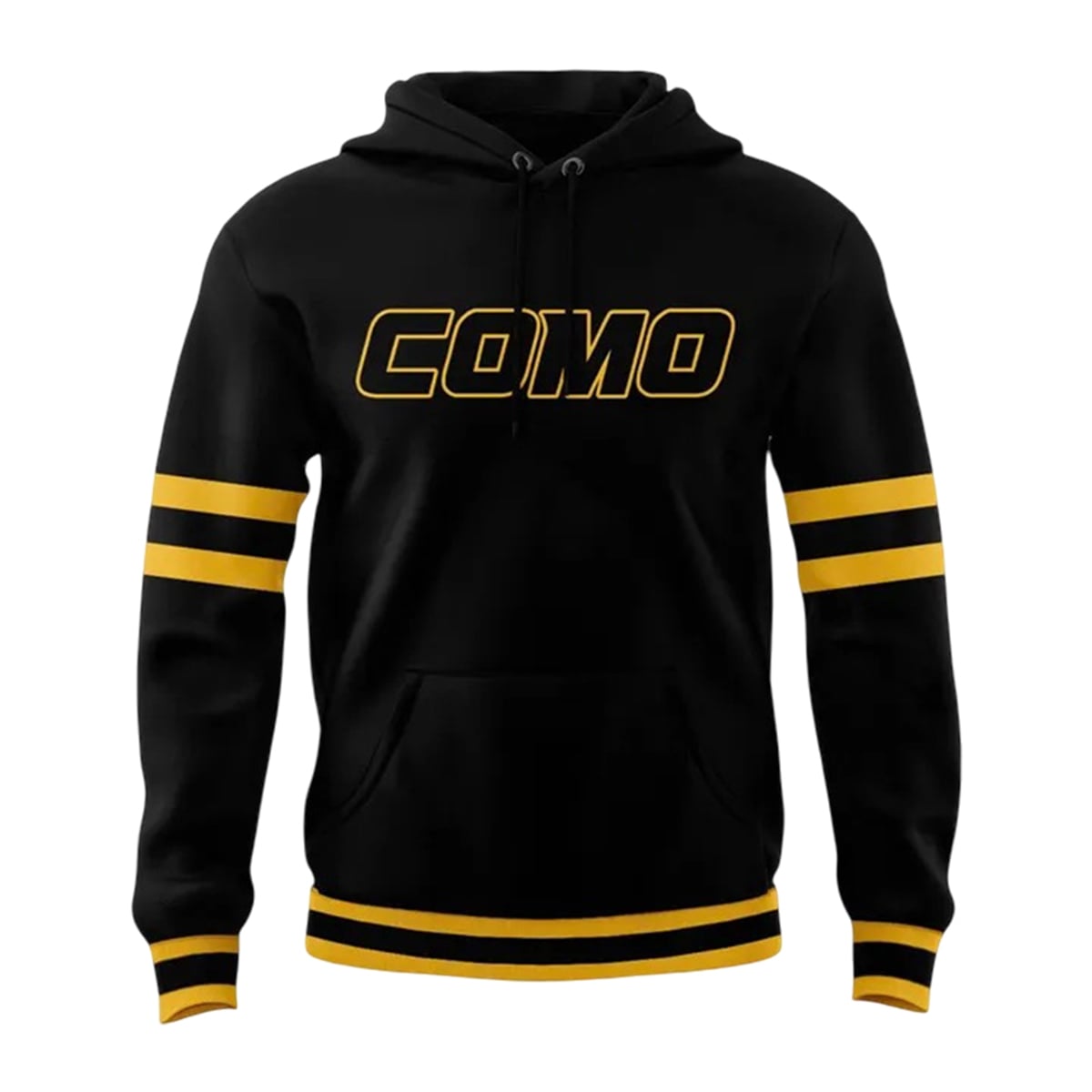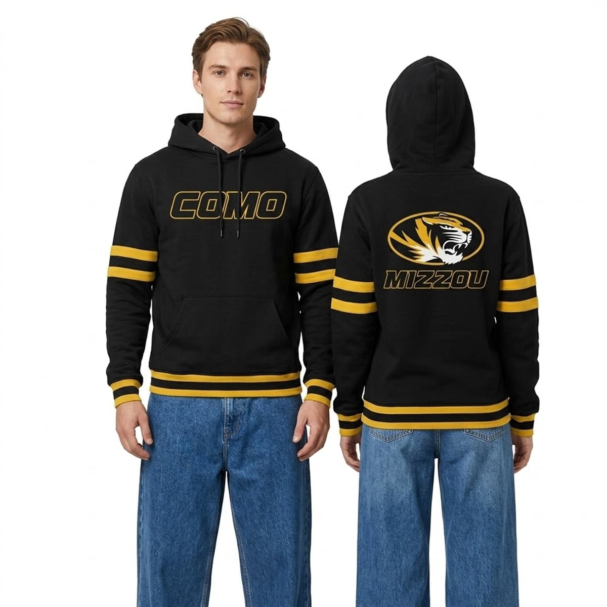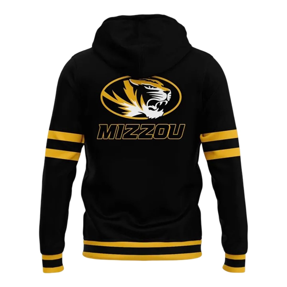 The hoodie offers a visually arresting design that commands attention from every angle. The jet-black foundation of the garment serves as the perfect canvas for the vibrant, athletic gold accents that define the University of Missouri’s iconic color palette. Bold, double-striped banding on the lower sleeves and the bottom hem channels a nostalgic, vintage varsity aesthetic, while the sleek, outlined “COMO” typography across the chest provides a modern edge. The back of the garment features the fierce, forward-facing Mizzou Tiger emblem encased in a sleek oval, positioned proudly above the classic “MIZZOU” lettering.