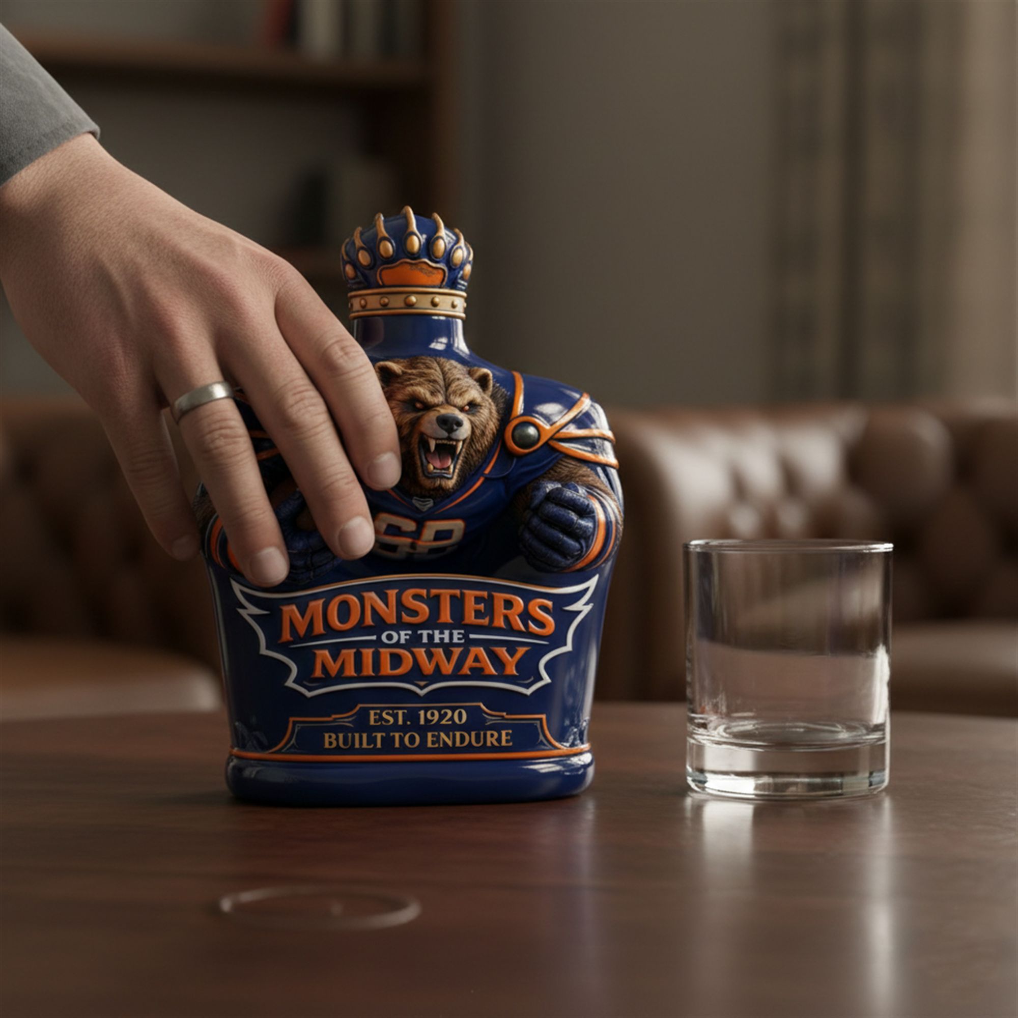 For the Chicago faithful, “Monsters of the Midway” is not just a nickname; it is an identity. This bottle design encapsulates that identity with aggressive styling and symbolic detail. The centerpiece is the roaring bear, armored in the team’s iconic navy and orange hues, clutching a football as if breaking through the defensive line.