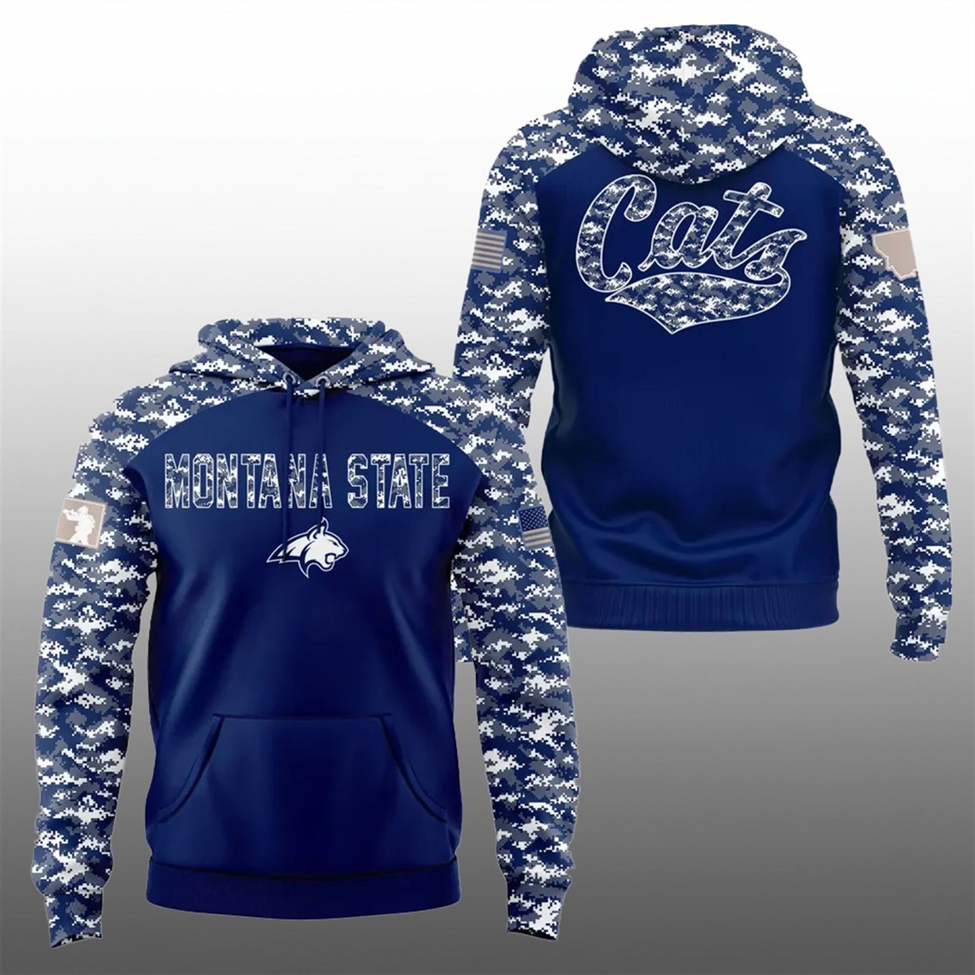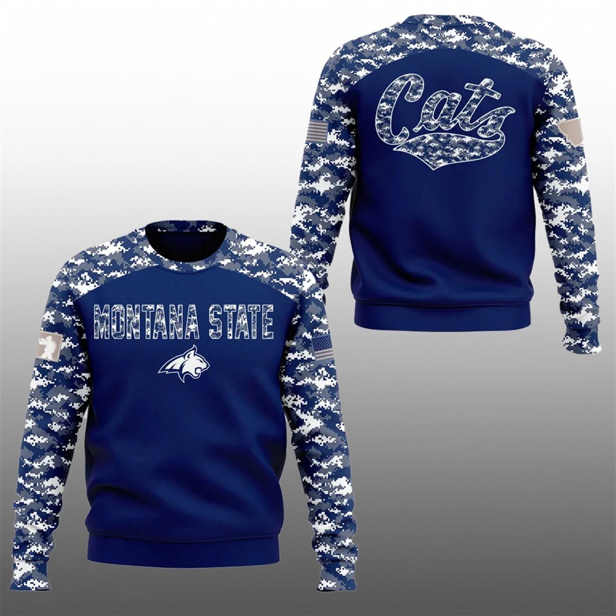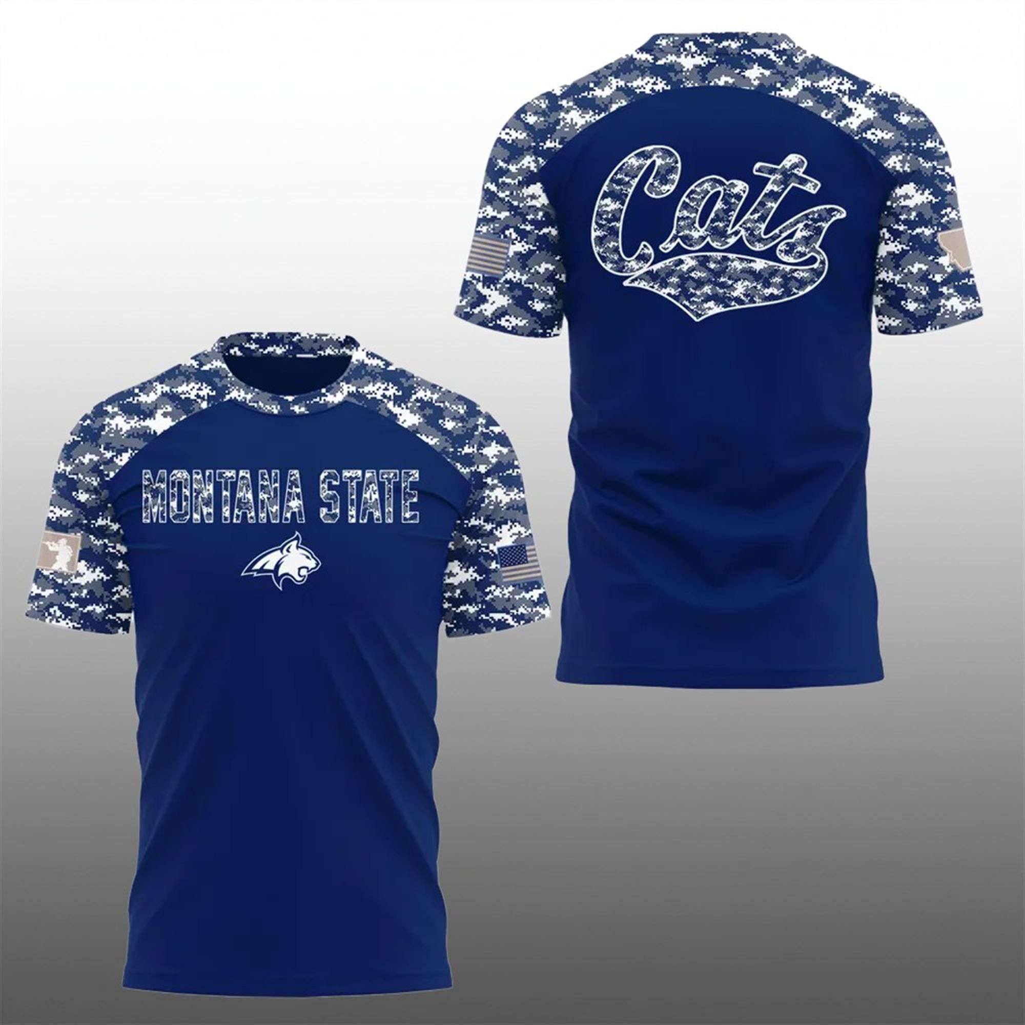 The 2025 Montana State Camo Salute to Service Shirt is more than just fan apparel; it is a symbol of respect and resilience. The design anchors on a deep navy blue body—the hallmark color of Montana State—contrasted vividly by digital naval camouflage on the raglan sleeves. This “digi-camo” pattern is a modern nod to military tactical gear, blending slate blues, whites, and grays to create a look that is aggressive yet polished.