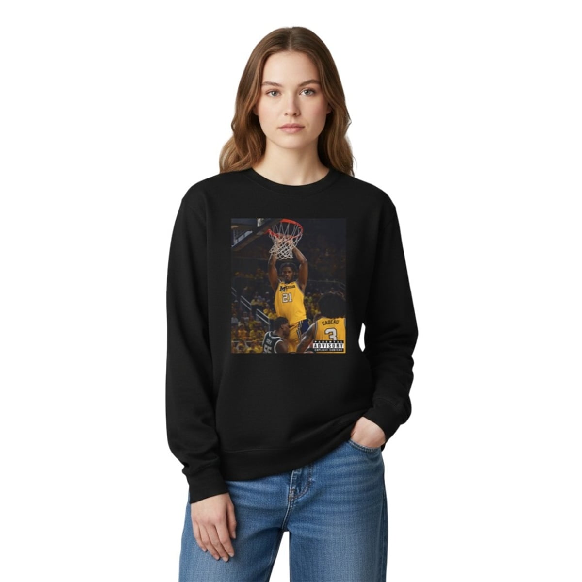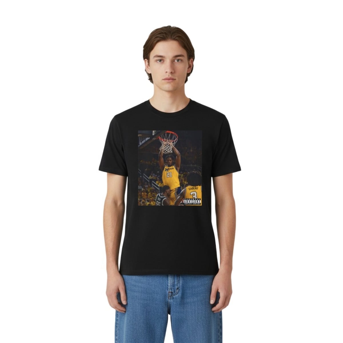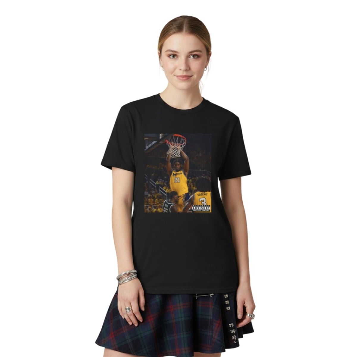 In the fast-paced world of basketball, certain moments transcend the final score and become instantly etched into sports lore. The shirt is a direct reflection of that phenomenon. This piece centers around a striking, high-contrast action photograph framed perfectly to capture the peak of athletic execution. Featuring a bold, retro-inspired aesthetic complete with the iconic “Parental Advisory Explicit Content” label, the design transforms a devastating on-court posterization into a work of modern art. It serves as a wearable tribute to hard-hitting hoops, bridging the gap between active sports fandom and urban fashion. For those who track the culture of the game just as closely as the stats, this item represents the pinnacle of game-day attitude.