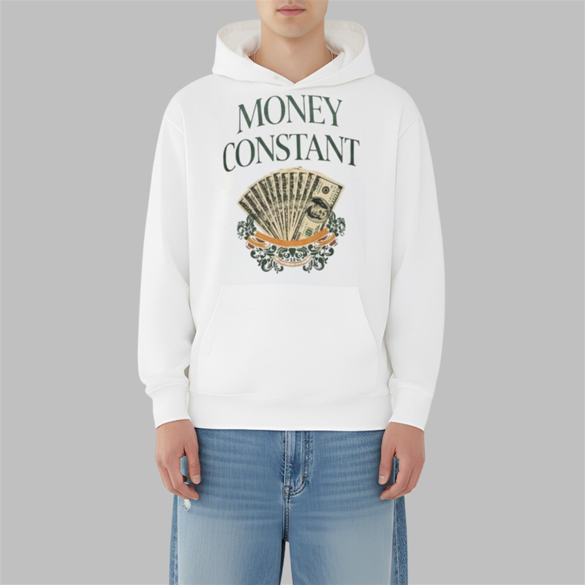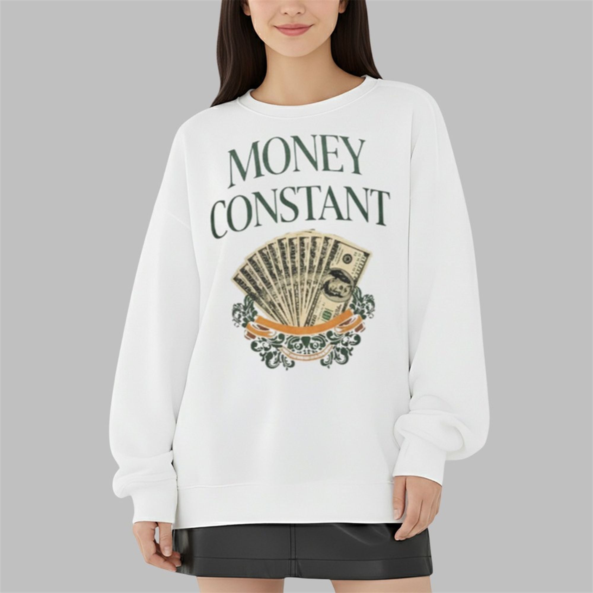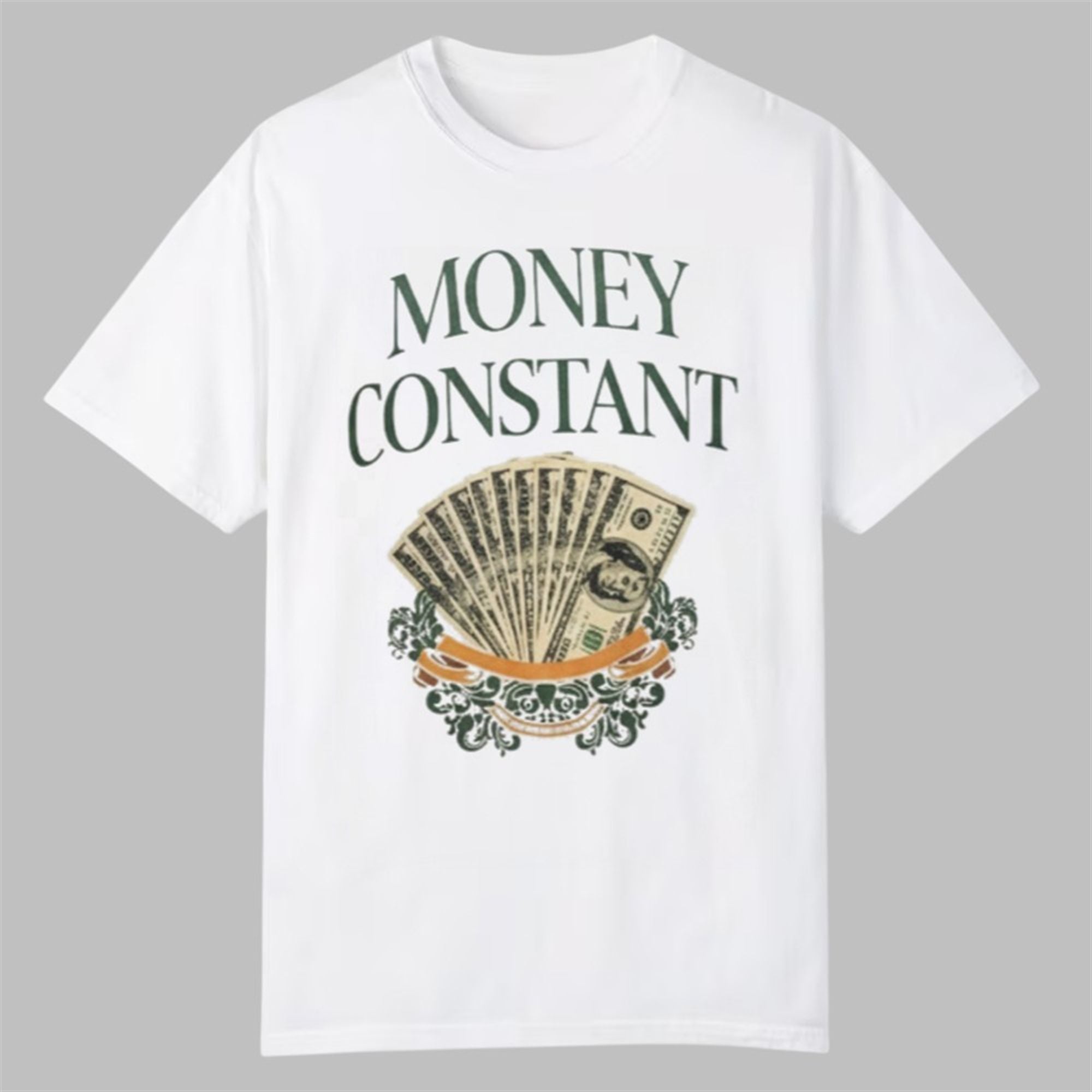The shirt is more than apparel; it is a cultural artifact born from the high-flying world of global music management. Featuring the bold, serif-font declaration “MONEY CONSTANT” arching over a detailed, vintage-inspired fan of currency and filigree, this design balances classic collegiate typography with the raw visual language of success.