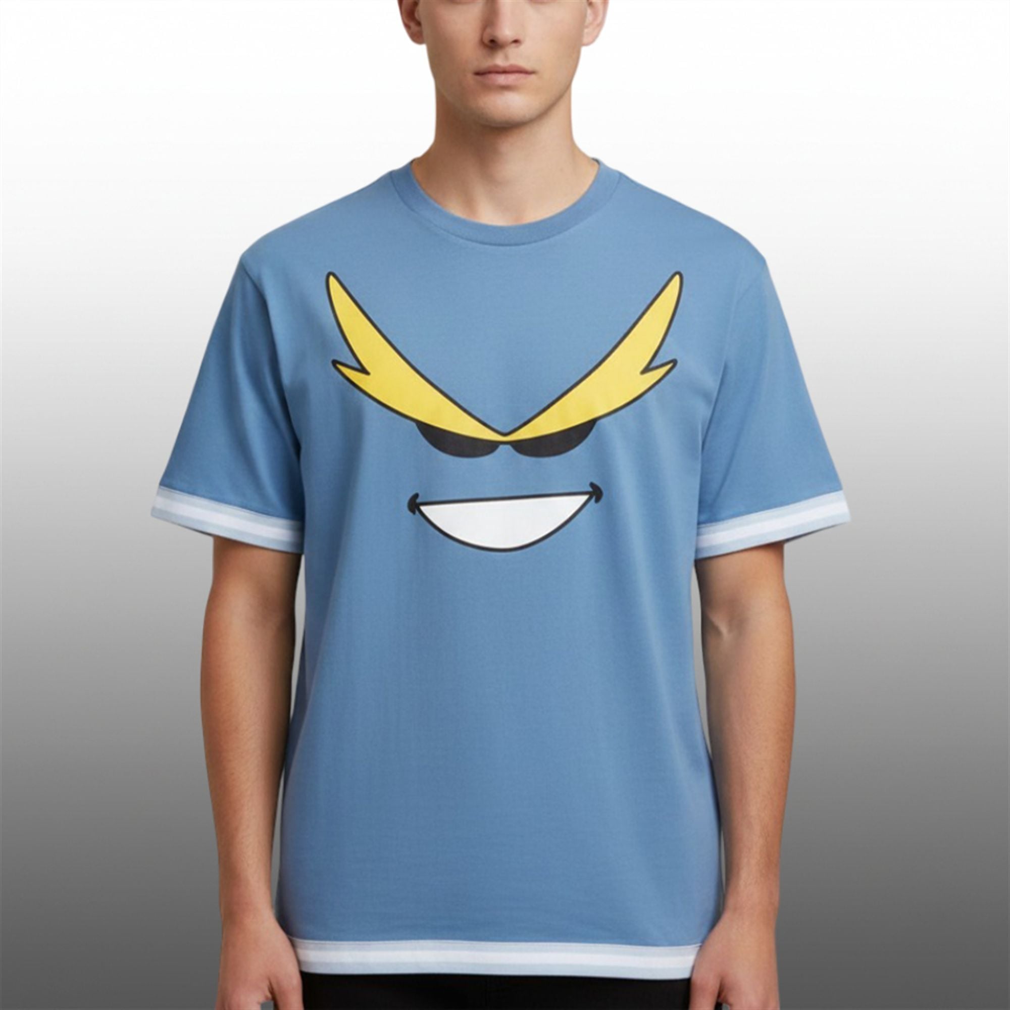 The shirt itself is a classic ringer tee, distinguished by its “Hero Blue” body and contrasting white ribbing on the collar and sleeve cuffs. This colorway pays homage to All Might’s Silver Age and Golden Age costumes, evoking the patriotic and primary colors associated with classic American comic book heroes, which heavily inspired his character design. The minimalist approach ensures the shirt is fashionable enough for daily wear while remaining instantly recognizable to the massive global community of My Hero Academia fans.