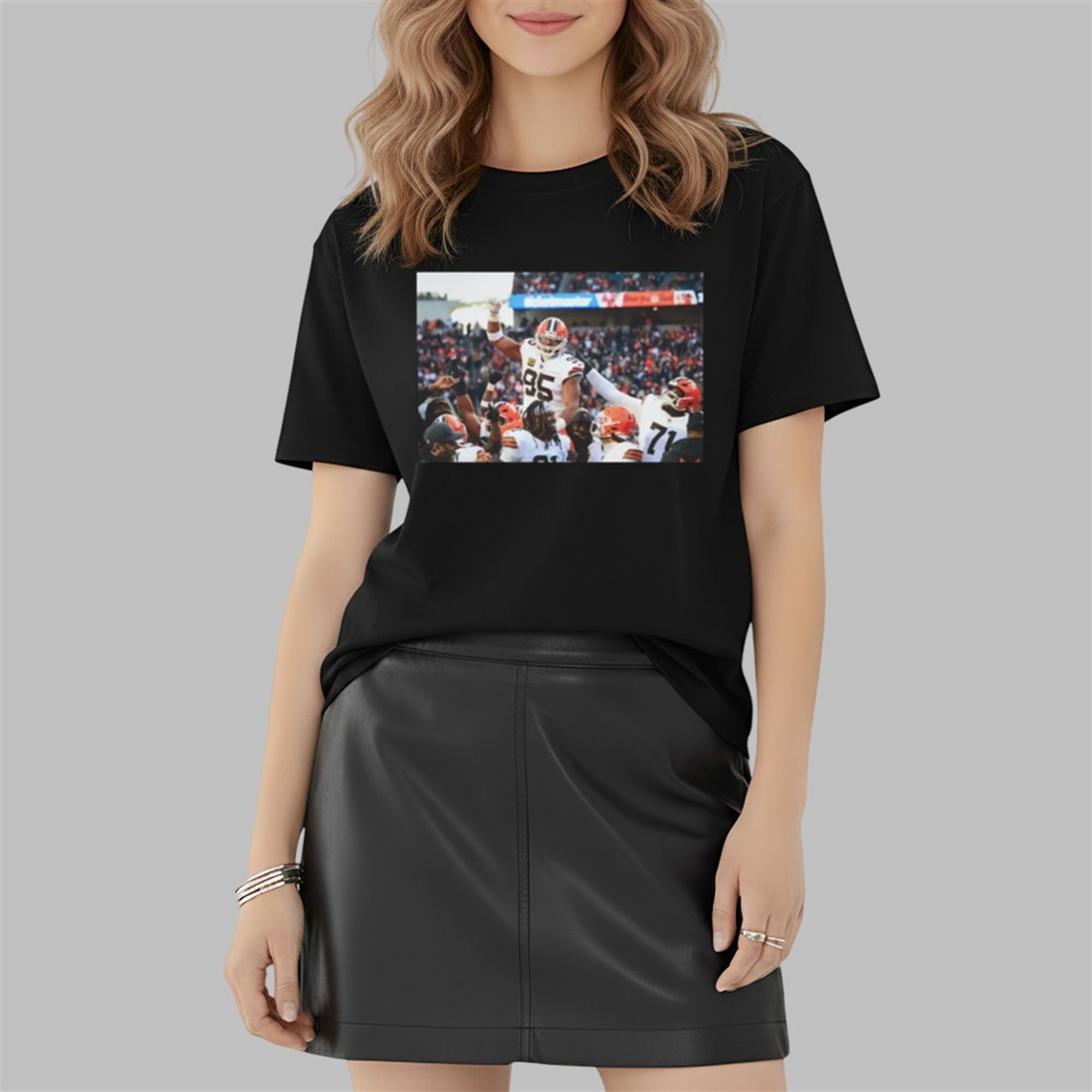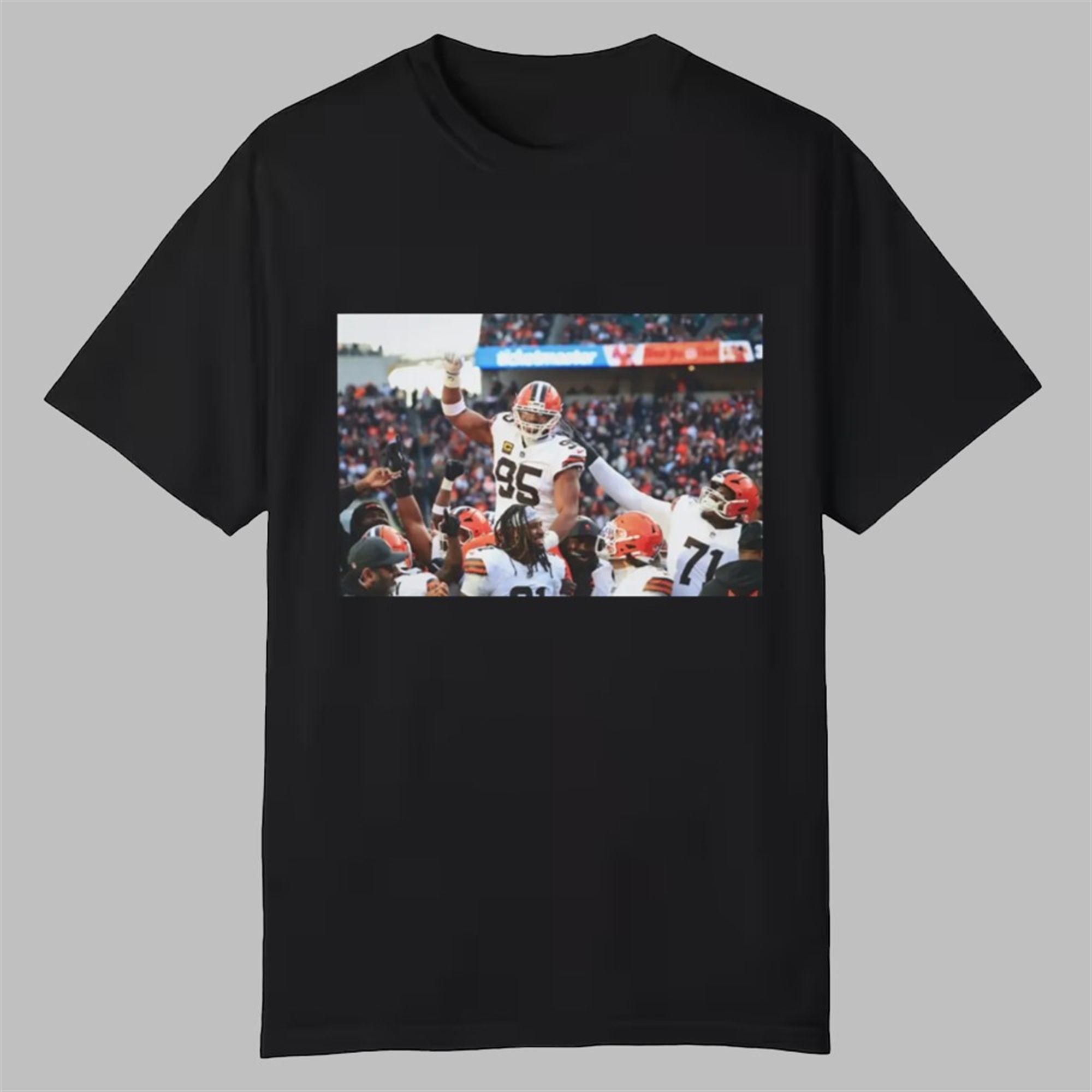 The image on this shirt became an instant internet sensation because it perfectly symbolized Garrett’s elevation above his peers. It wasn’t just a celebration; it looked like a coronation. As teammates lifted him into the air, the camera angle captured Garrett towering over the field like a titan, embodying the “Sack King” persona fans have championed for years. The sheer joy on the faces of the offensive and defensive linemen surrounding him highlighted his role not just as a star, but as the heartbeat of the entire franchise, making this the most shared image of January 2026.