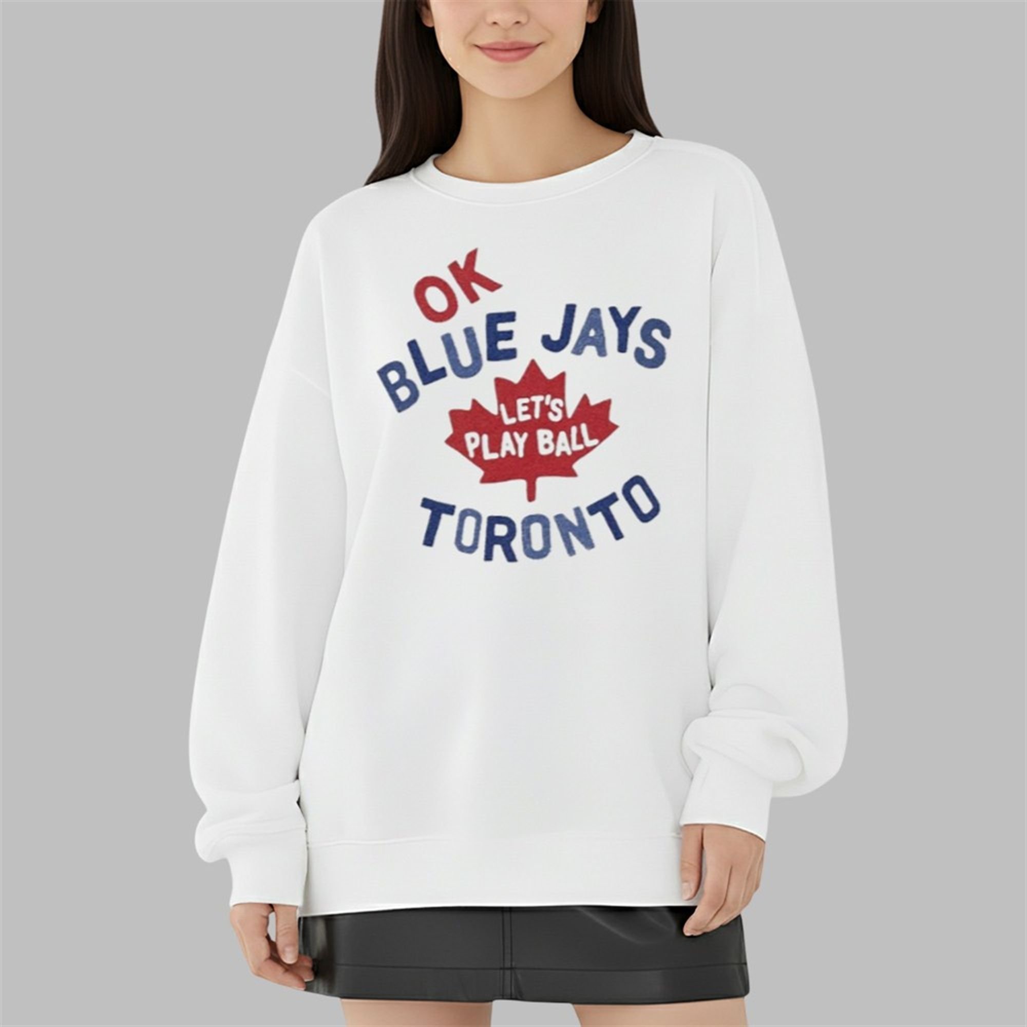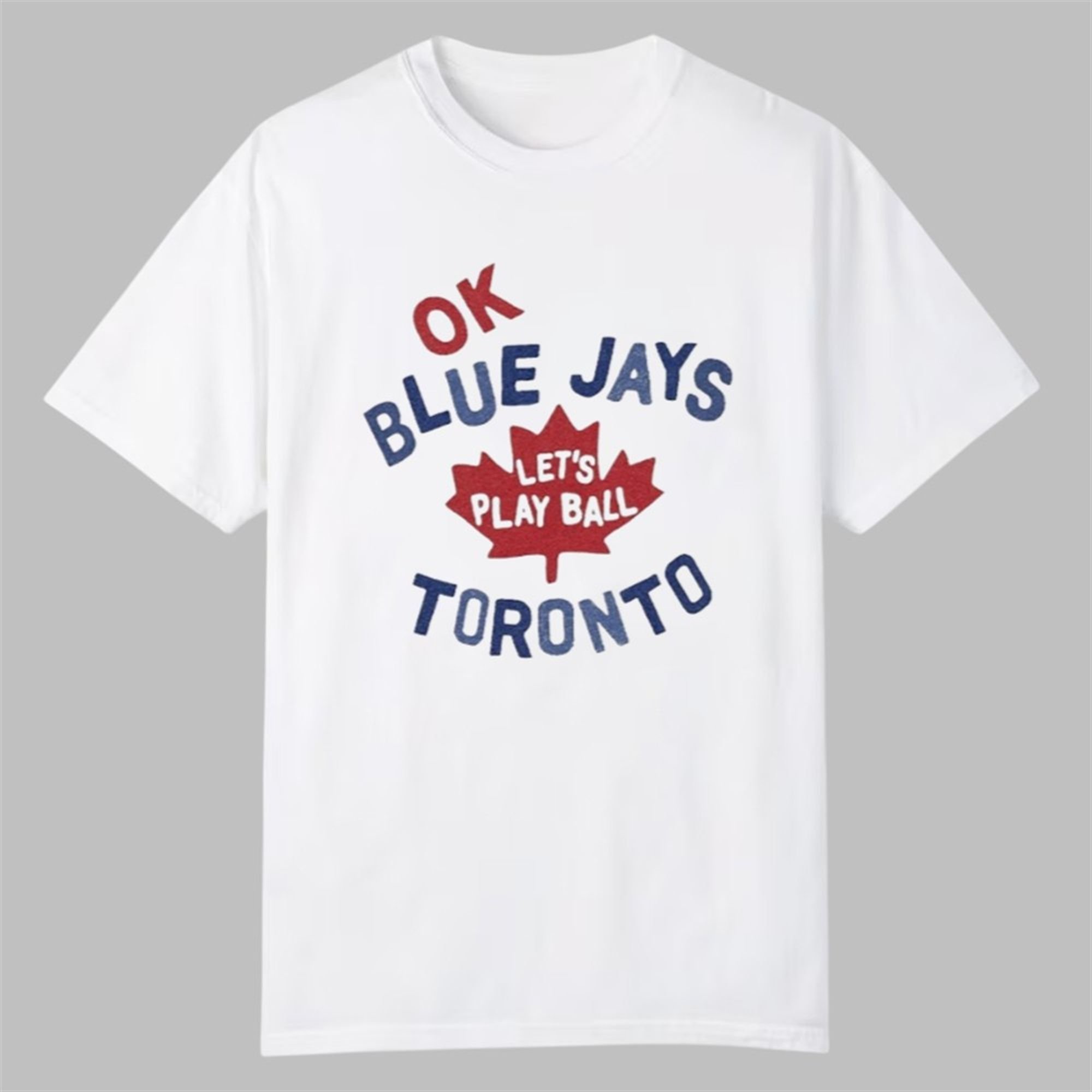 The design itself is a masterpiece of sports nostalgia. The phrase “OK BLUE JAYS LET’S PLAY BALL” is rendered in a classic, distressed font that gives it a perfect, worn-in feel from the very first day. The bold, red maple leaf at the center firmly roots the design in its Canadian heritage, making it an unapologetically Toronto-centric piece.