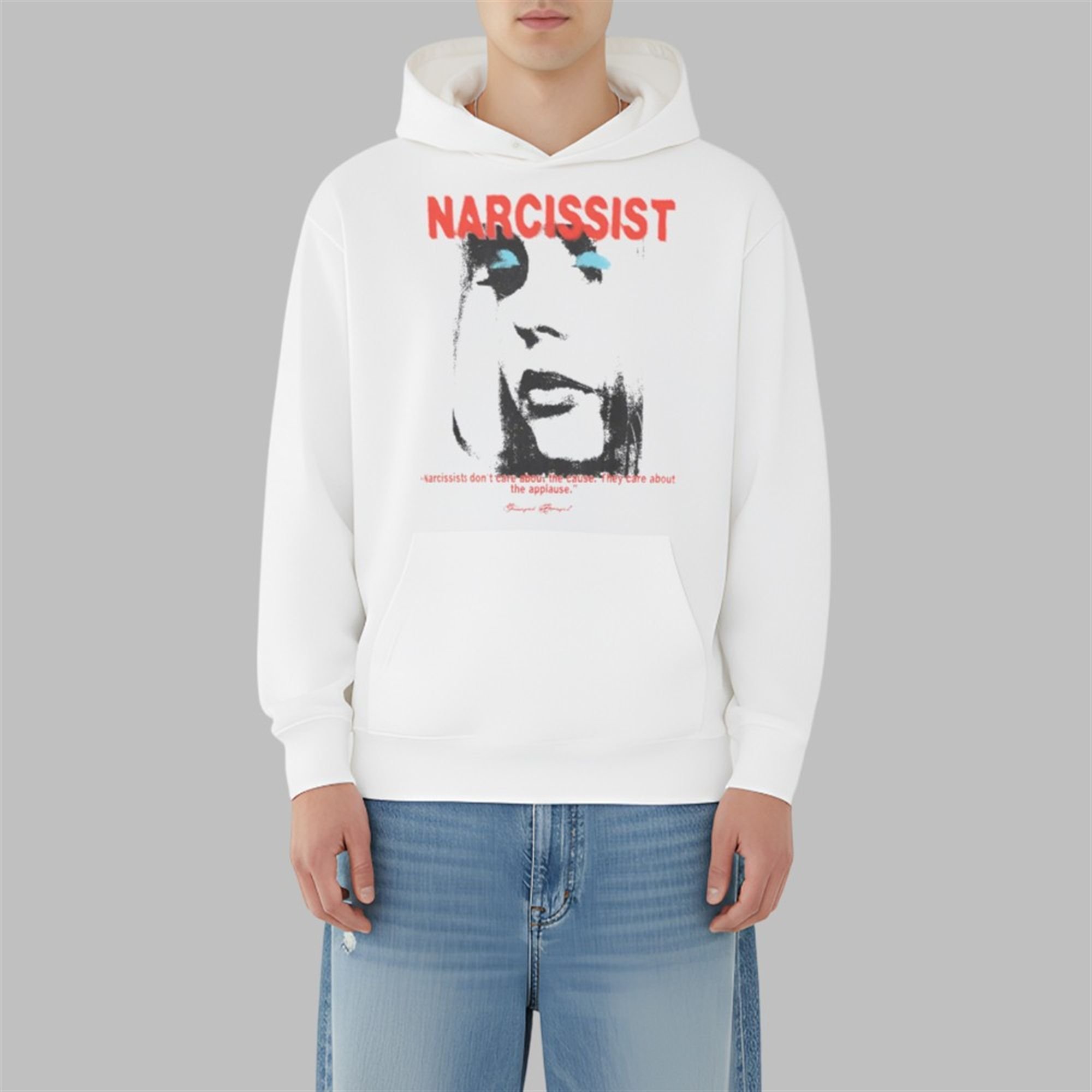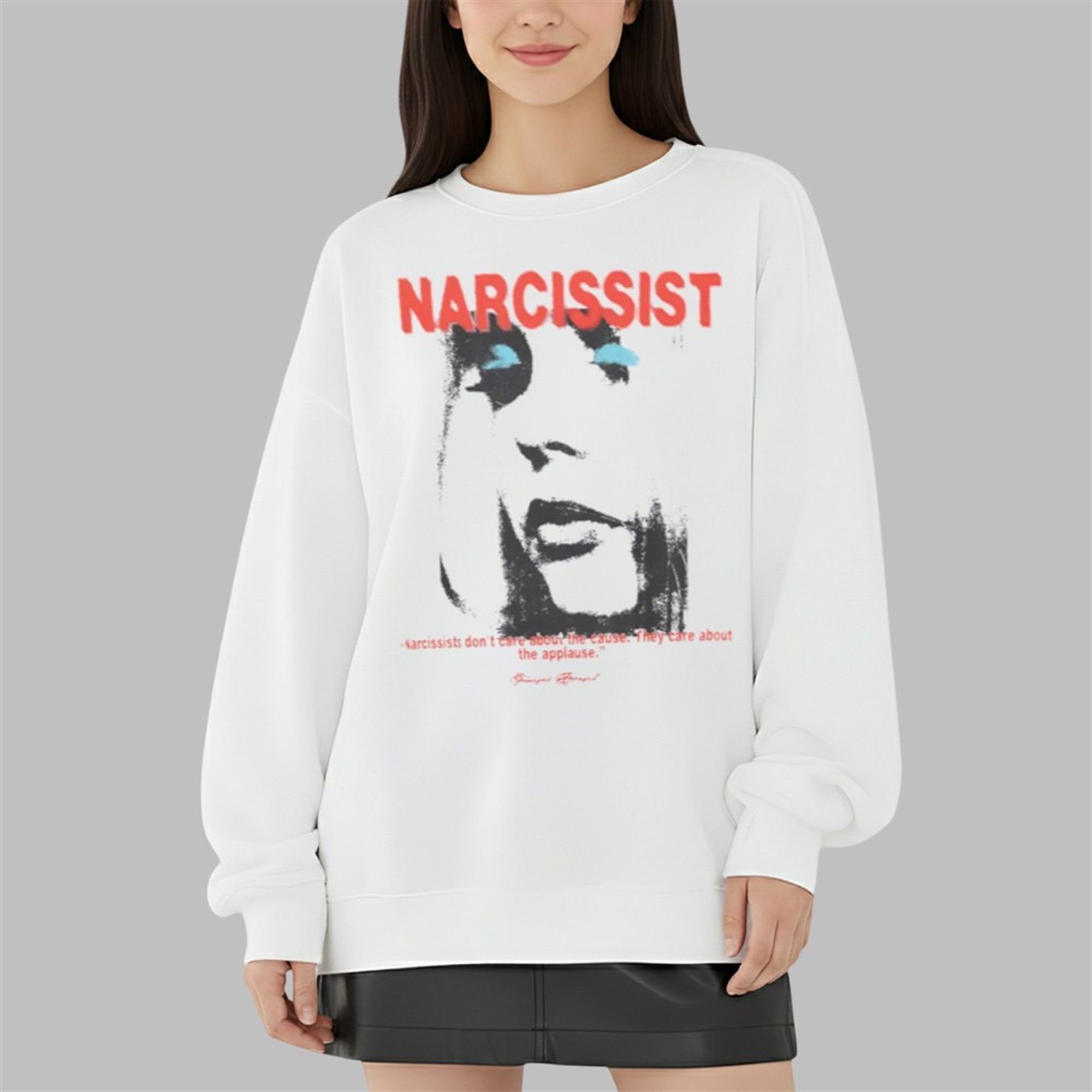 This shirt’s power lies in its provocative, deconstructed aesthetic. The design is fearlessly centered around the word “NARCISSIST,” printed in a bold, disruptive red font that immediately captures the eye and sets the tone. Below this, a high-contrast, stylized portrait provides a grunge-inspired, artistic focal point. The face, rendered in deep, grainy blacks and stark whites, evokes a sense of distorted reality and raw emotion.