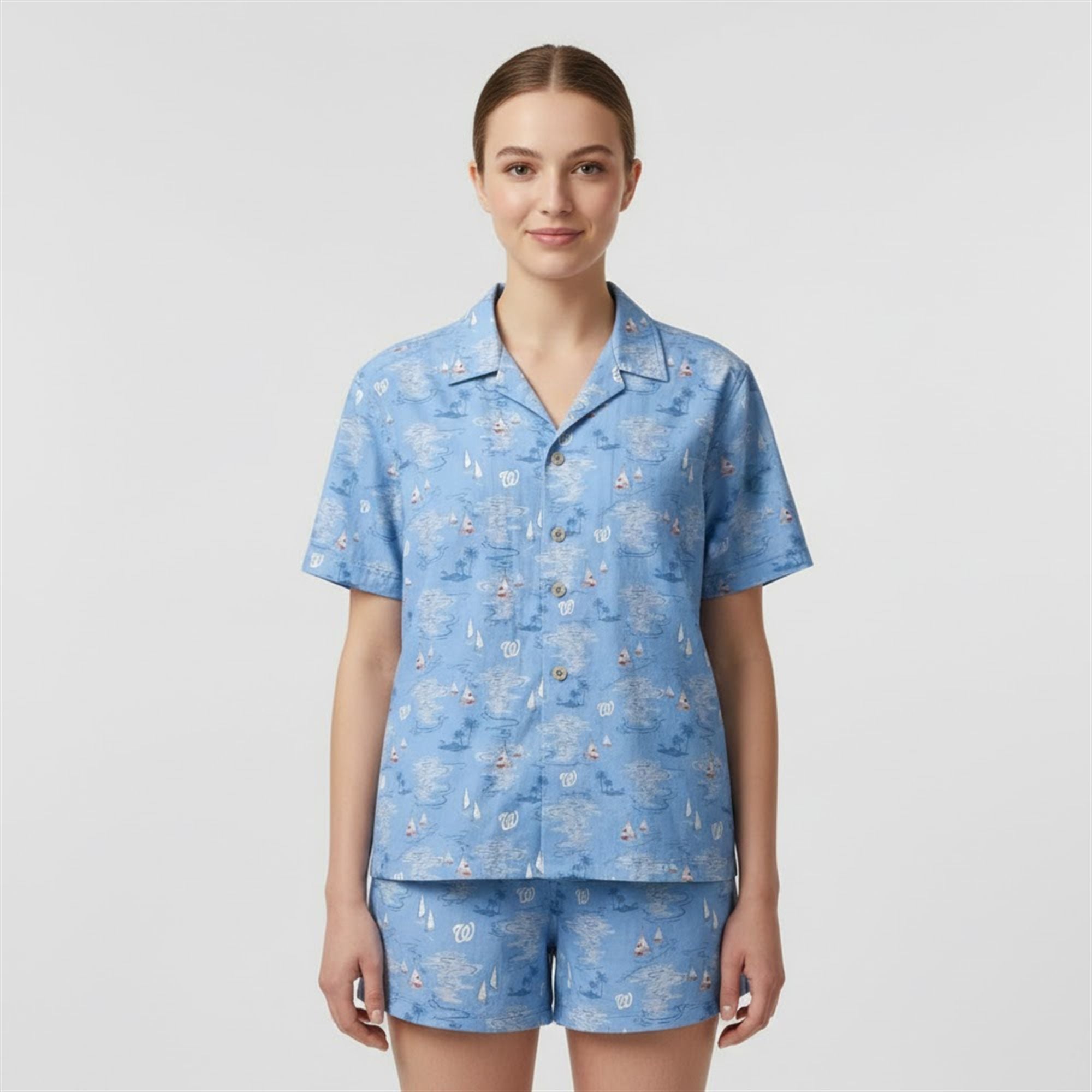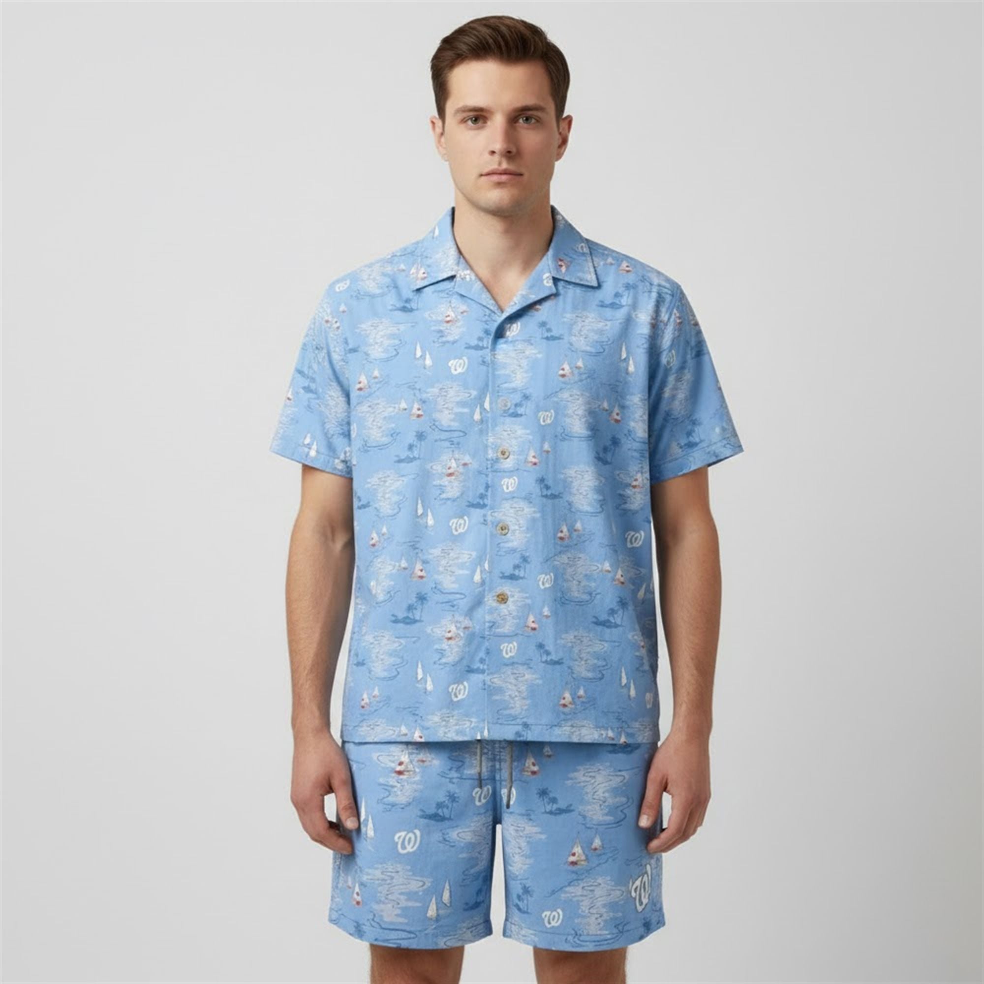 Visually, the shirt and shorts feature detailed illustrations of sailboats navigating calm waters, interspersed with tropical palm trees and the unmistakable Washington Nationals “Curly W” logo. The white and red accents on the sailboats pop against the blue background, subtly nodding to the team’s colors without overpowering the laid-back Hawaiian theme. The button-down shirt offers a classic resort silhouette with a sharp collar, while the matching shorts complete the ensemble with a comfortable, adjustable drawstring waist. It is a cohesive look that works as a loud, proud full outfit or as separates mixed into your daily rotation.
