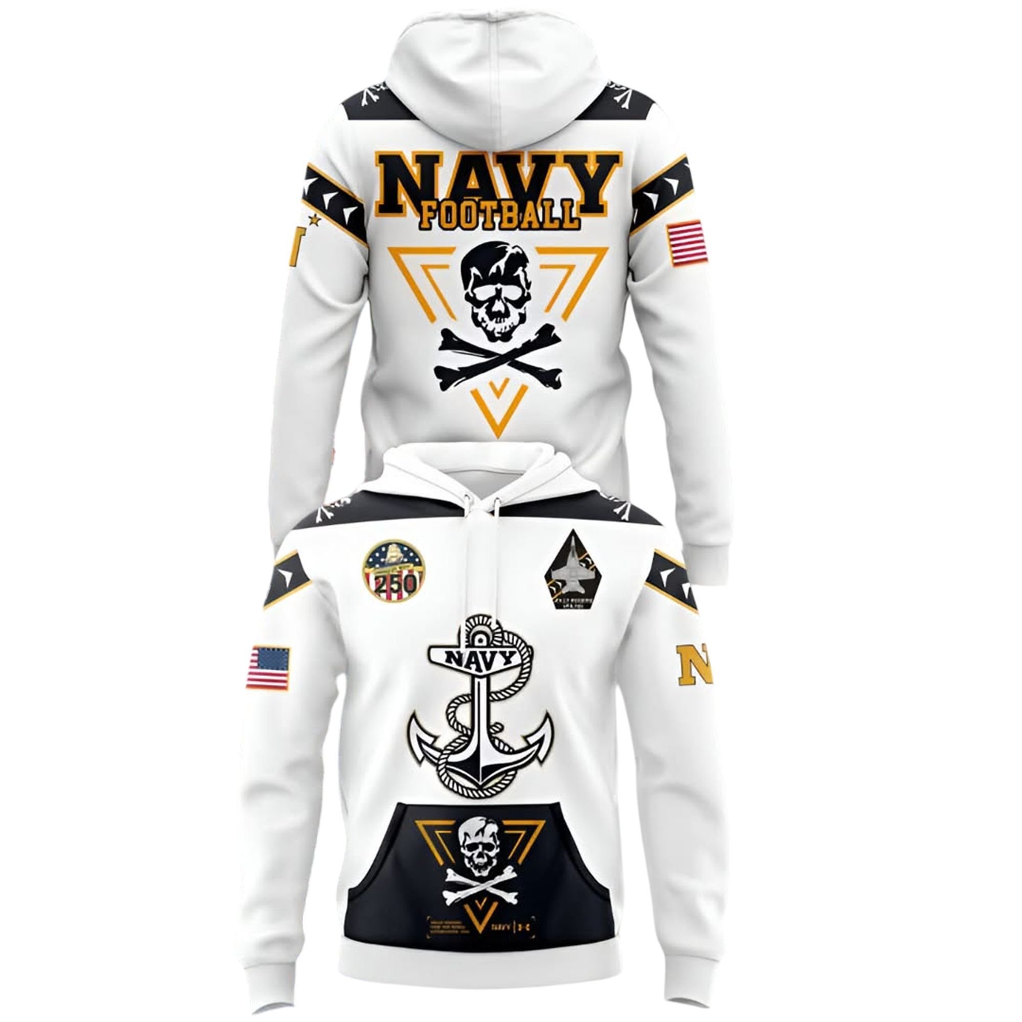 The Back: Make a statement as you leave. The back of the hoodie shouts your loyalty with massive “NAVY FOOTBALL” text above an oversized skull and crossbones graphic, framed by a striking gold chevron. This design is built to be seen from the stands, at a tailgate, or on the street.