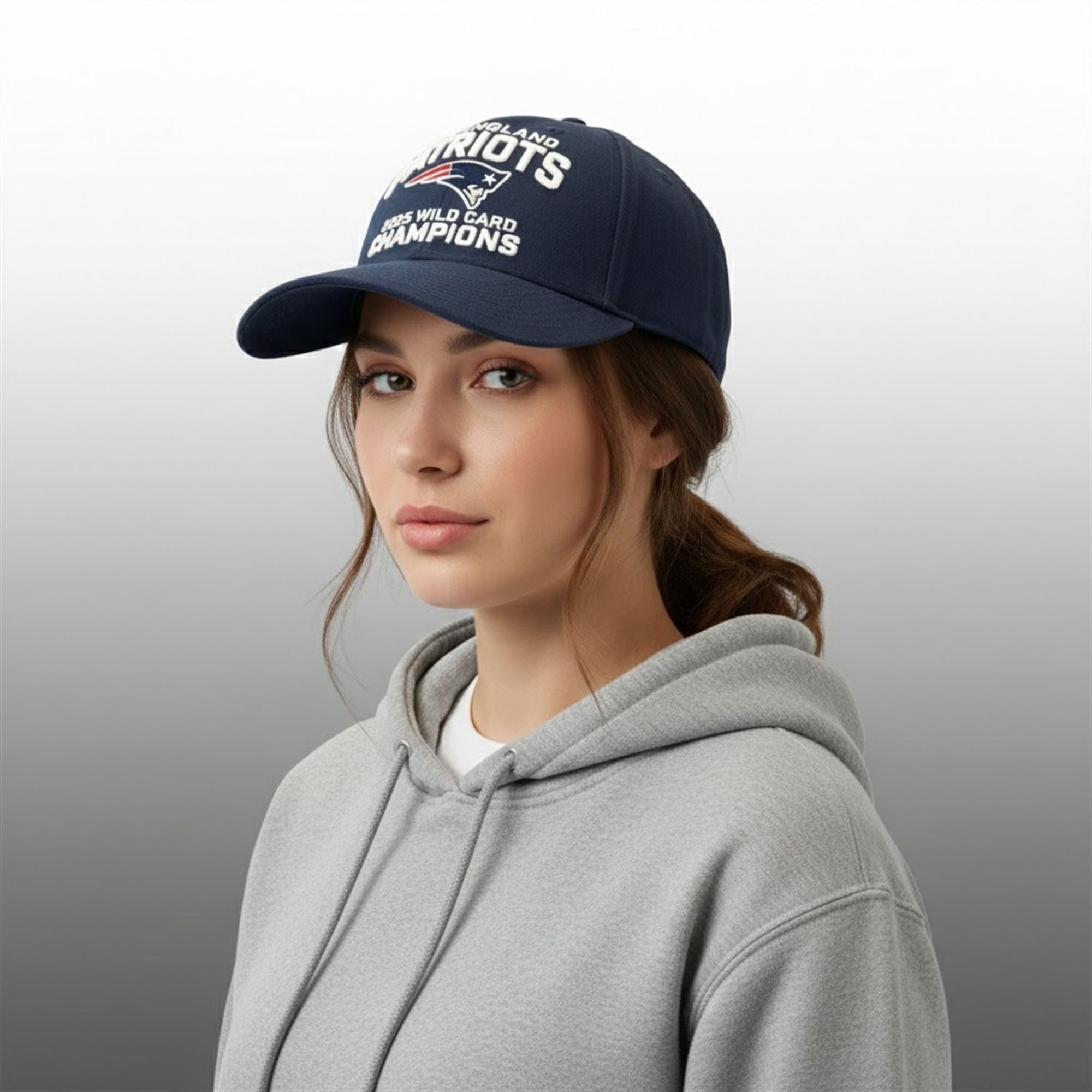This fan gear is an exact replica of what the players and coaching staff wore immediately following their Wild Card victory. The design features a structured navy blue crown that highlights the classic “New England Patriots” wordmark in raised, white. Below the iconic Flying Elvis logo, the text “2025 WILD CARD CHAMPIONS” is stitched in bold, commemorative lettering. The pre-curved visor provides a classic silhouette that looks great on game day or in the off-season. This hat isn’t just merchandise; it is a trophy you can wear, marking a pivotal moment in the 2025 season.