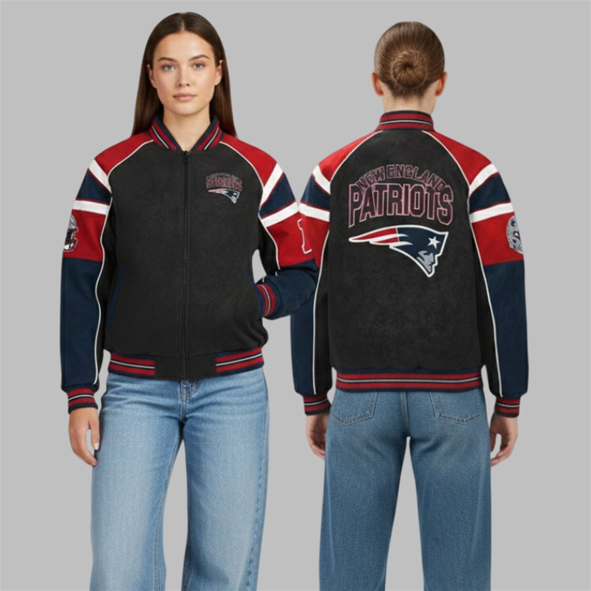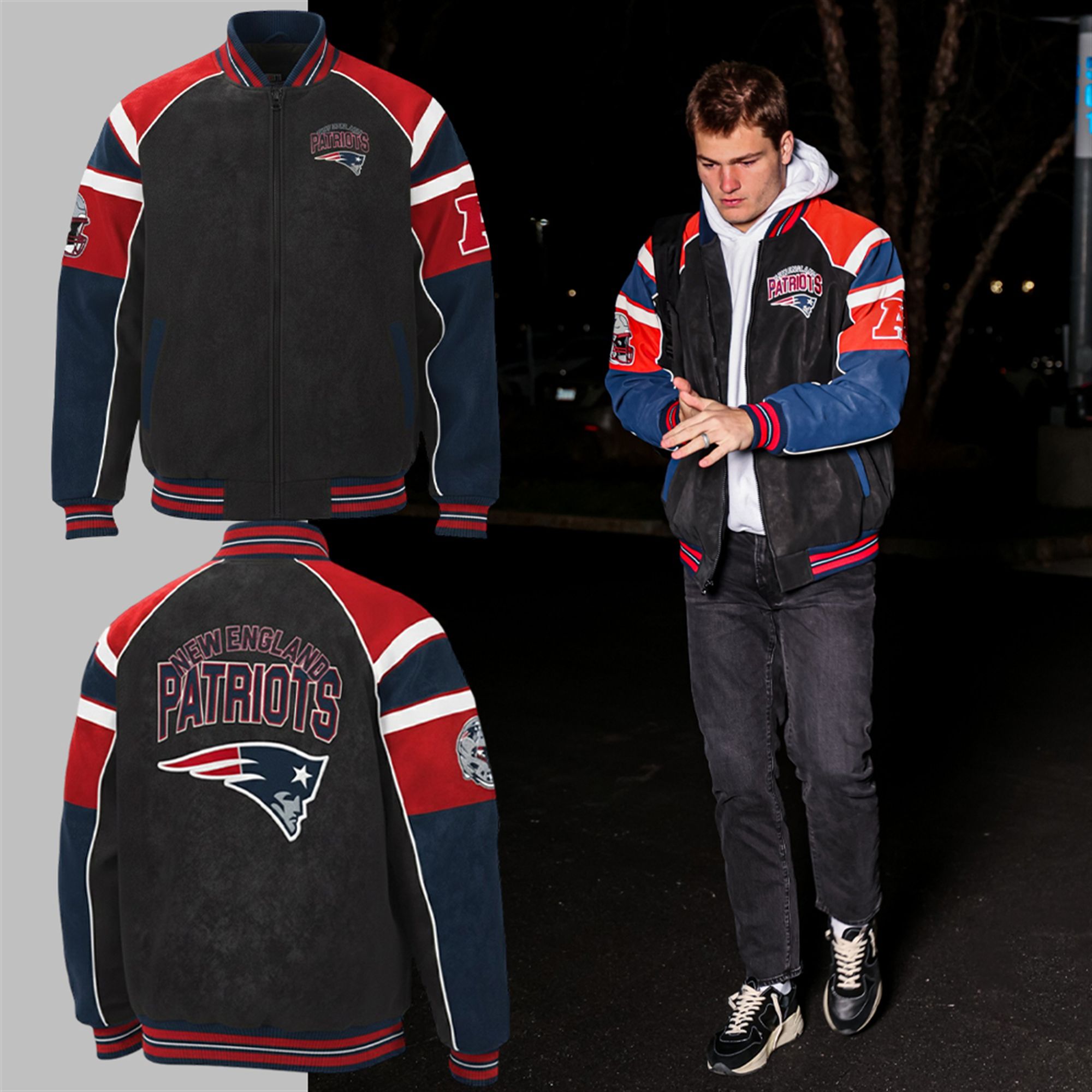 The back of the jacket is the centerpiece, boasting an oversized, “New England Patriots” wordmark arching over the “Flying Elvis” logo. The detailing continues on the sleeves with the classic AFC conference patch and helmet insignia, solidifying the jacket’s authenticity. A full-zip front ensures versatility for layering over hoodies or jerseys, while the striped ribbed collar, cuffs, and hem provide a snug fit to keep the New England chill at bay.