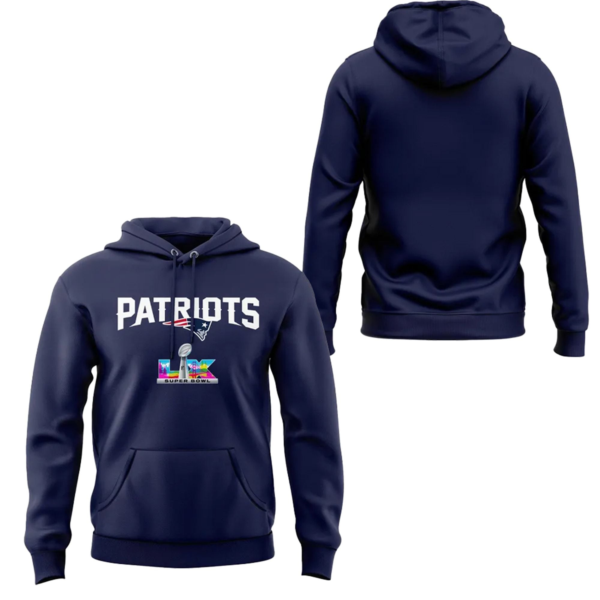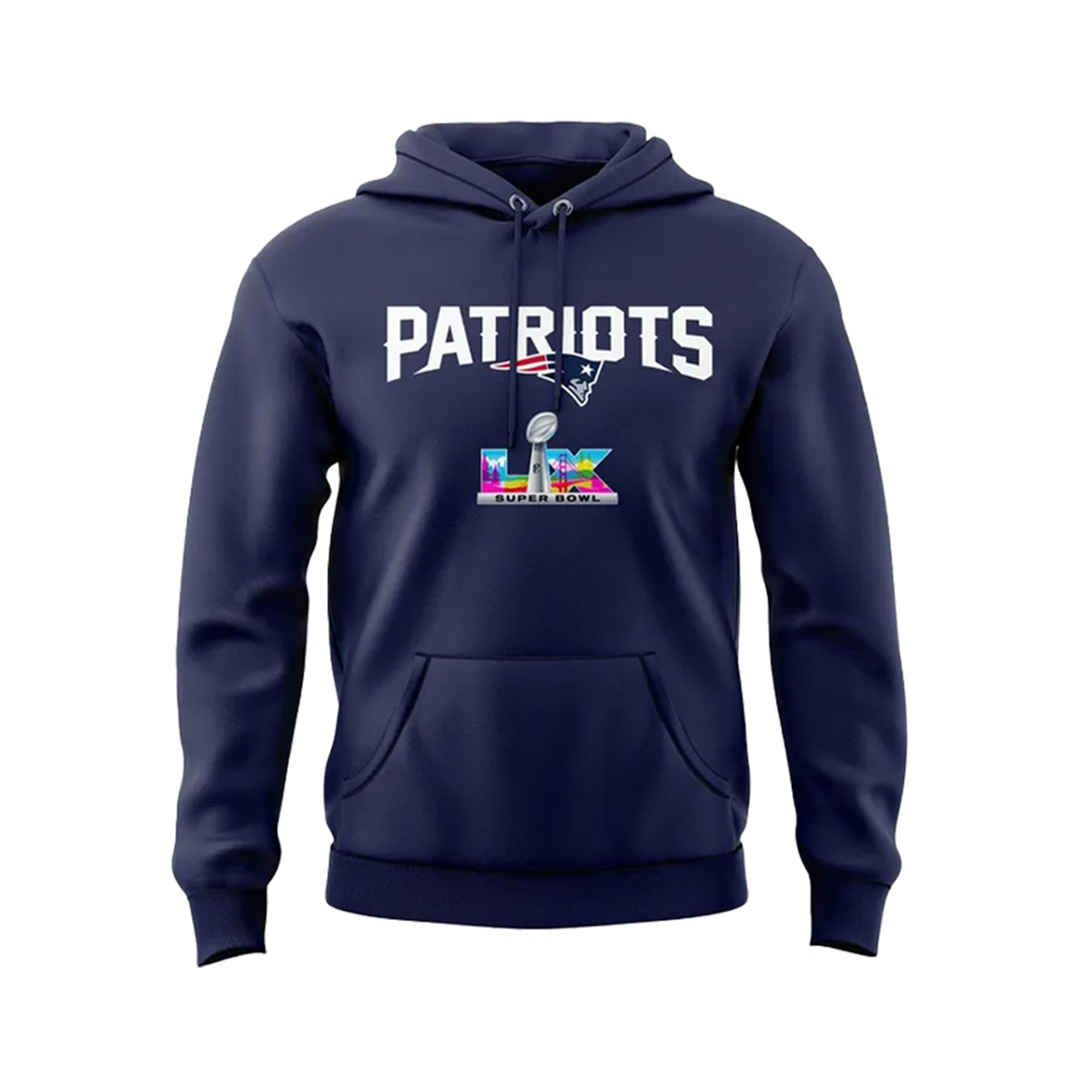 The 2025-2026 season will be remembered as the year the Patriots’ “True Belief” returned. This hoodie celebrates the team’s 12th Super Bowl appearance—a record. With the Patriots currently tied at six rings, this game represents the “Drive for Seven,” the quest to become the undisputed franchise with the most championships in football history. This hoodie captures that ambition with the bold “PATRIOTS” wordmark arched over the iconic Flying Elvis and the LX (60) insignia, which incorporates the silhouettes of the Golden Gate Bridge and the California Redwoods.