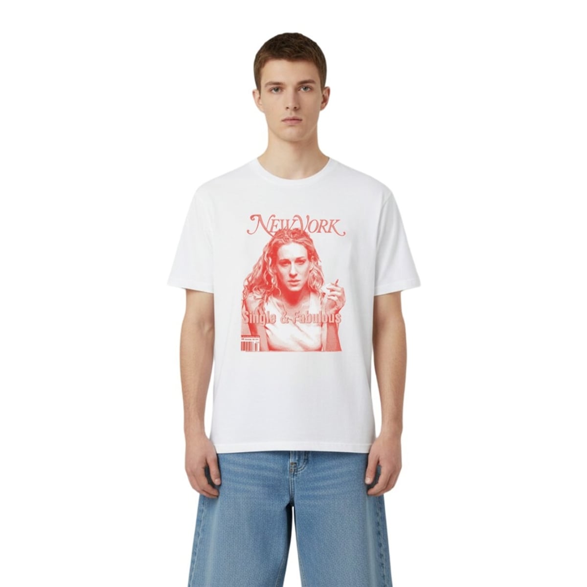 The shirt brings one of television’s most memorable moments directly to your wardrobe. The design features a striking, vintage-inspired red graphic printed against a stark white background, creating a high-contrast look that immediately draws the eye. At the center is the unmistakable, slightly disheveled yet effortlessly cool portrait of everyone’s favorite fictional writer, framed by a classic magazine masthead and a retro barcode at the bottom corner. The aesthetic perfectly mimics the look of a printed editorial cover, allowing you to seamlessly integrate a piece of late 90s and early 2000s media history into your daily outfits. It is a visually arresting piece of streetwear that speaks volumes through its bold typography and iconic imagery.