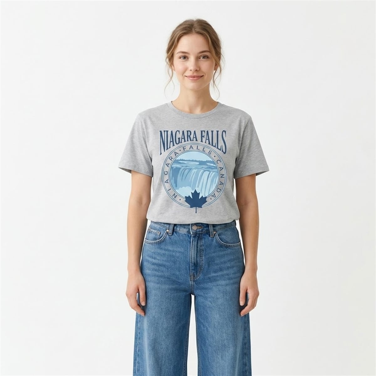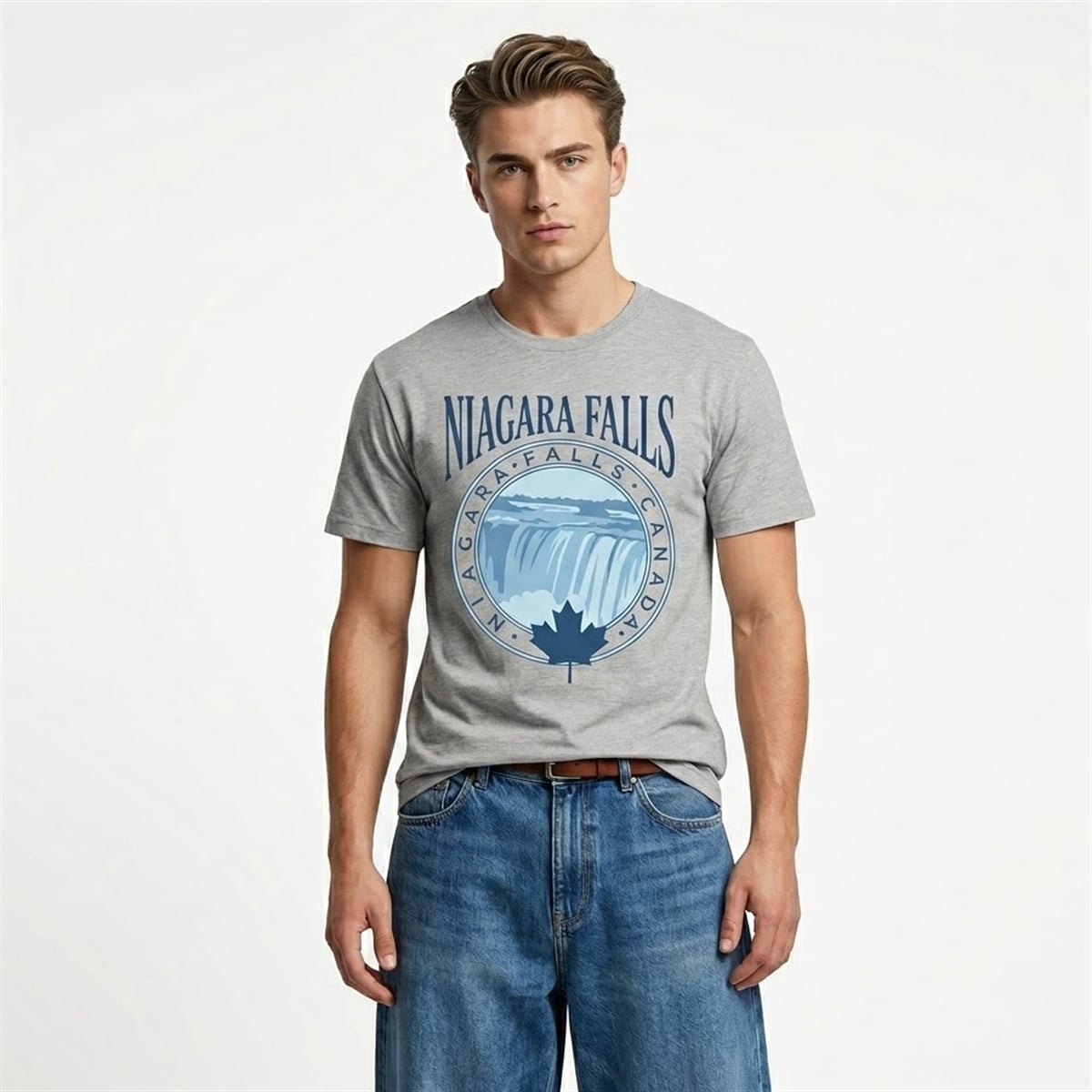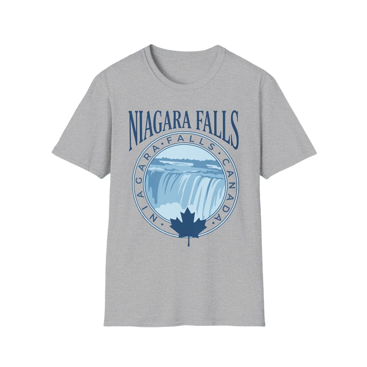The shirt is a masterclass in visual storytelling and destination-inspired fashion. Visually, the garment features a beautifully composed circular emblem set against a highly versatile, neutral grey background. The focal point is a stylized, multi-tonal blue illustration of the cascading waters of Niagara Falls, capturing the dynamic, sweeping motion of the legendary landmark.