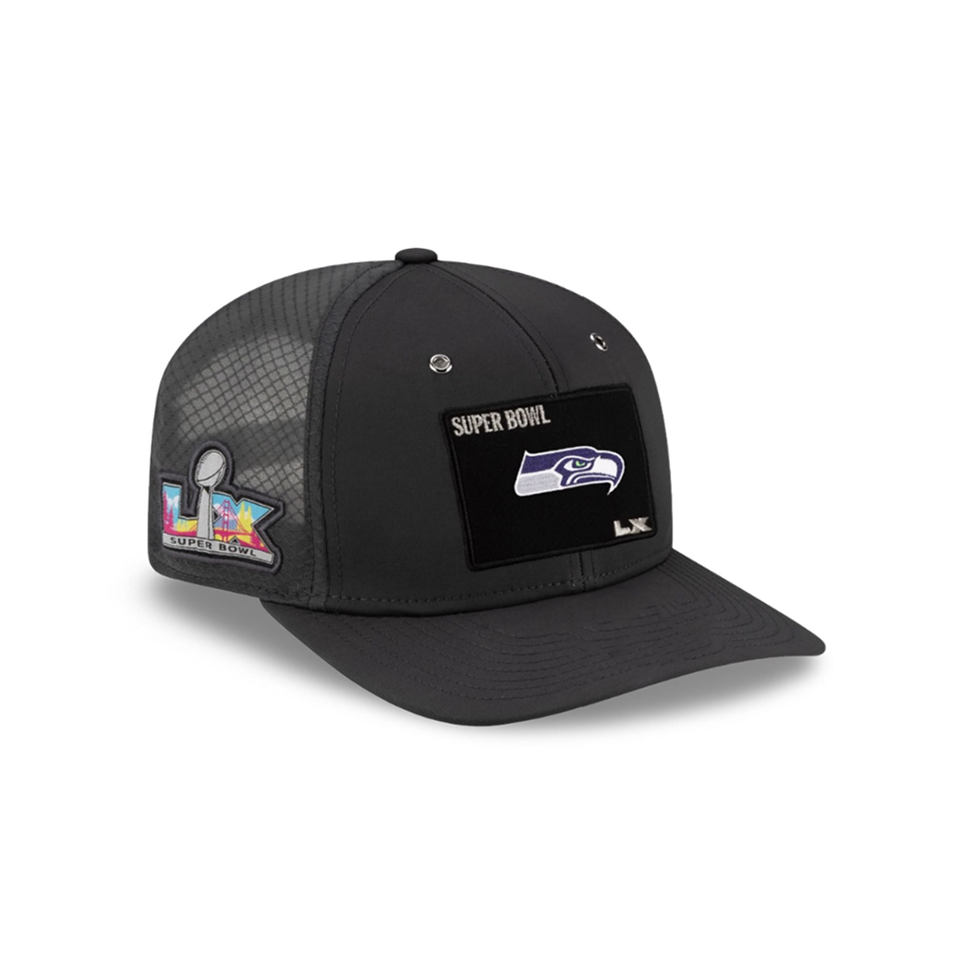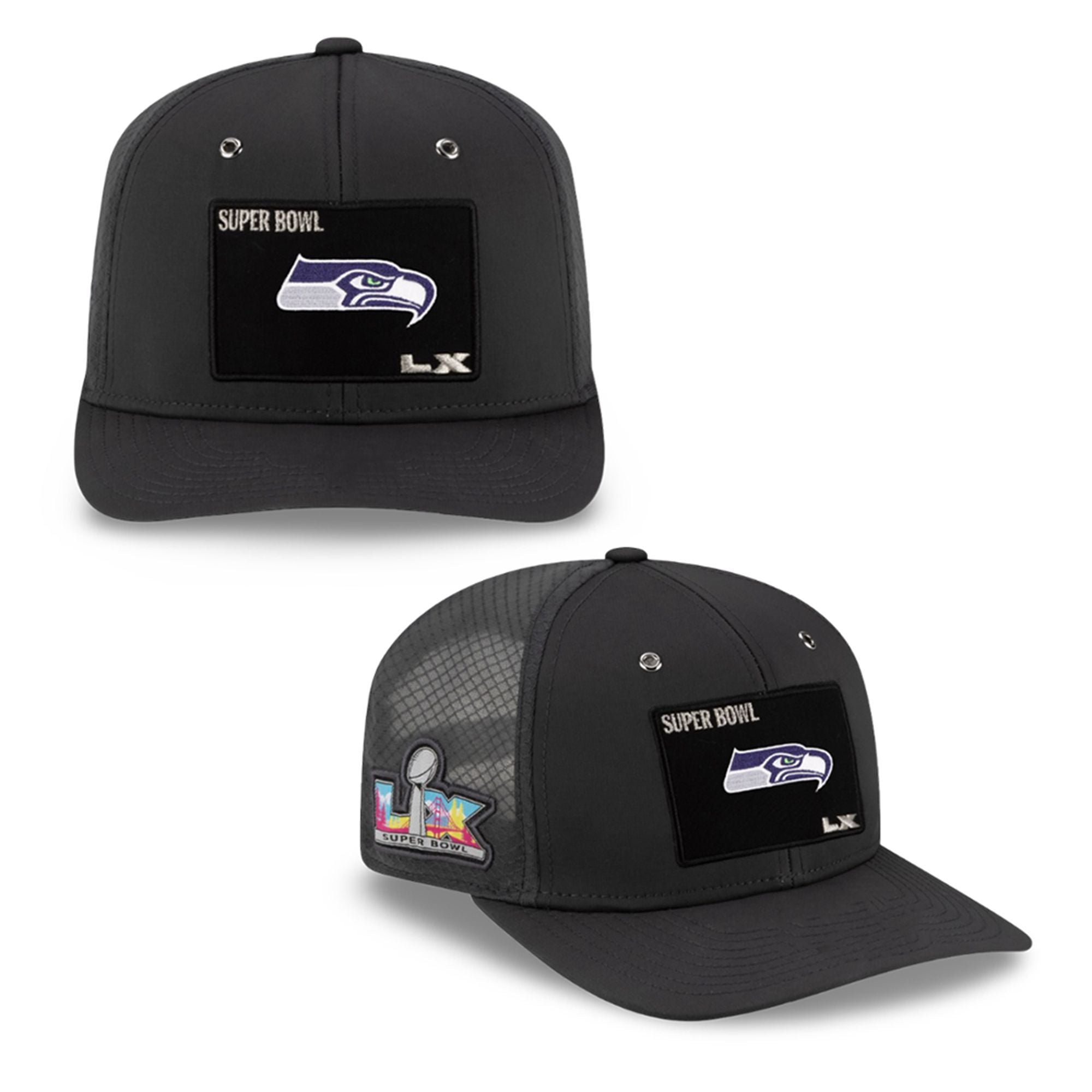 The hat is the definitive headwear for the modern 12th Man. This is the exact silhouette seen on sidelines and in locker rooms throughout the NFC playoffs, specifically associated with Nick Emmanwori’s meteoric rise. The design seamlessly integrates the “LX” Roman numeral branding—referencing the historic 60th Super Bowl in the San Francisco Bay Area—with the aggressive Seahawks hawk-head logo.