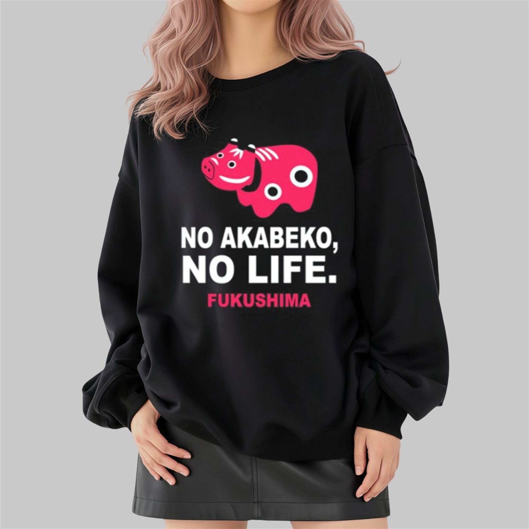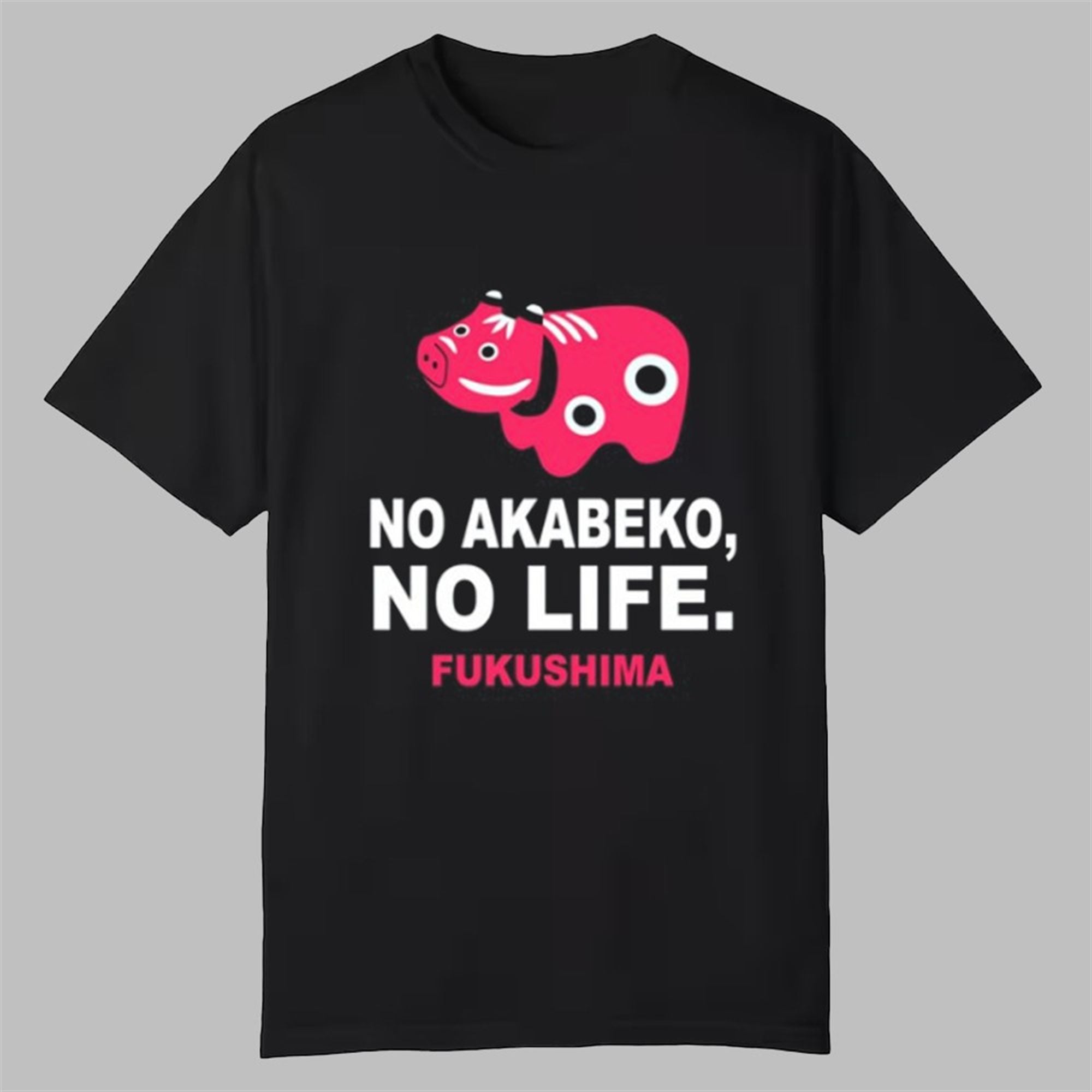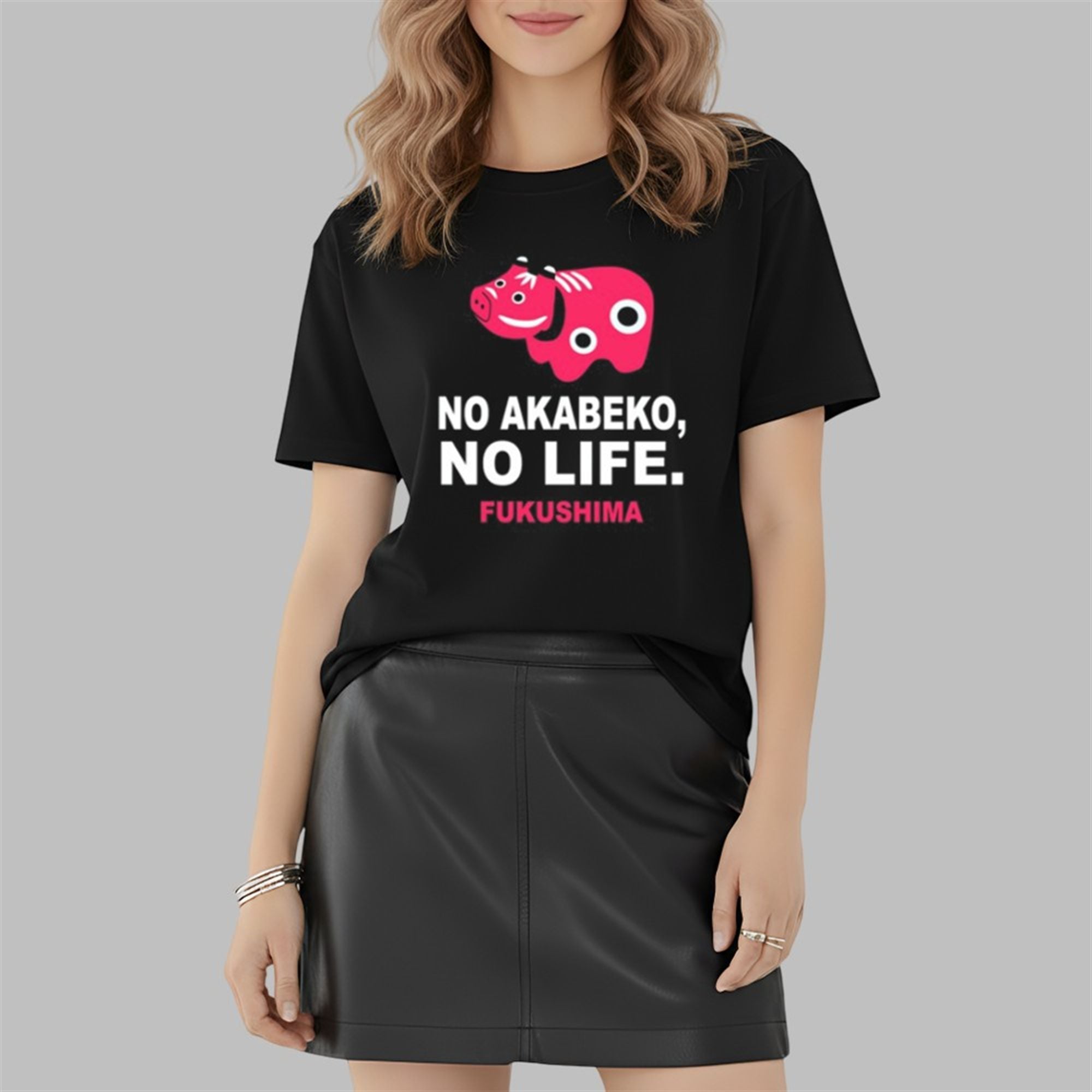 Below the graphic, the bold, white typography declares “NO AKABEKO, NO LIFE,” a playful parody that instantly contextualizes the image for a modern audience. The addition of “FUKUSHIMA” in a matching red tone anchors the design to its geographical roots, making it a proud badge of identity for the region. This isn’t just a random graphic; it is a piece of storytelling art that references the 9th-century legend of the red cow that helped build the Enzō-ji Temple and the toy’s later association with protection against smallpox. Wearing this shirt is akin to wearing a modern talisman—a stylish charm for health and perseverance.