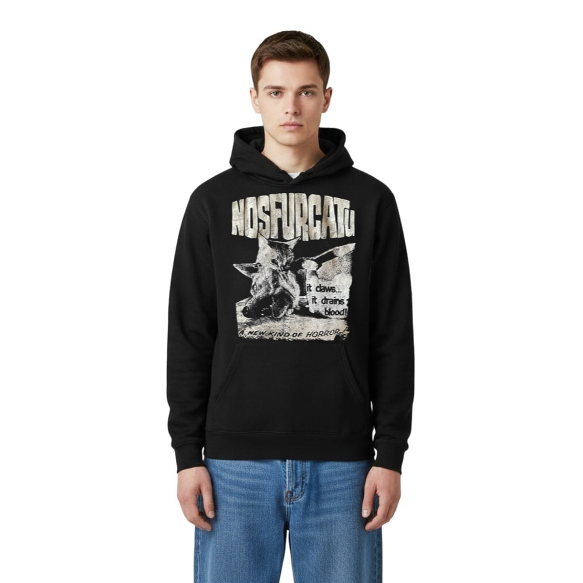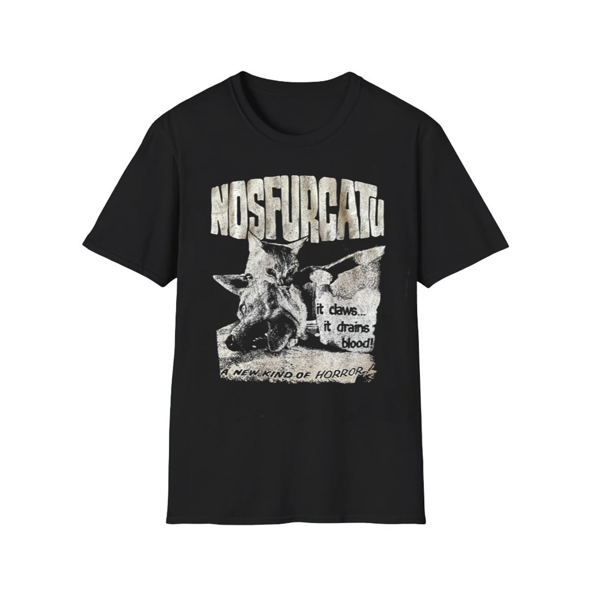 The tee is a visual triumph that expertly mimics the distressed, high-contrast look of antique movie advertisements. At the top, the bold, weathered lettering proclaims “NOSFURCATU,” setting the stage for the dramatic scene below. The central artwork features a mischievous cat fiercely latching onto the neck of an exasperated dog, stylized in gritty, monochromatic halftone dots. Flanking this chaotic animal encounter are the ominous, vintage-style taglines: “it claws… it drains blood!” and “A NEW KIND OF HORROR.” The design uses negative space brilliantly, allowing the dark background to emphasize the eerie, retro vibe of the illustration.