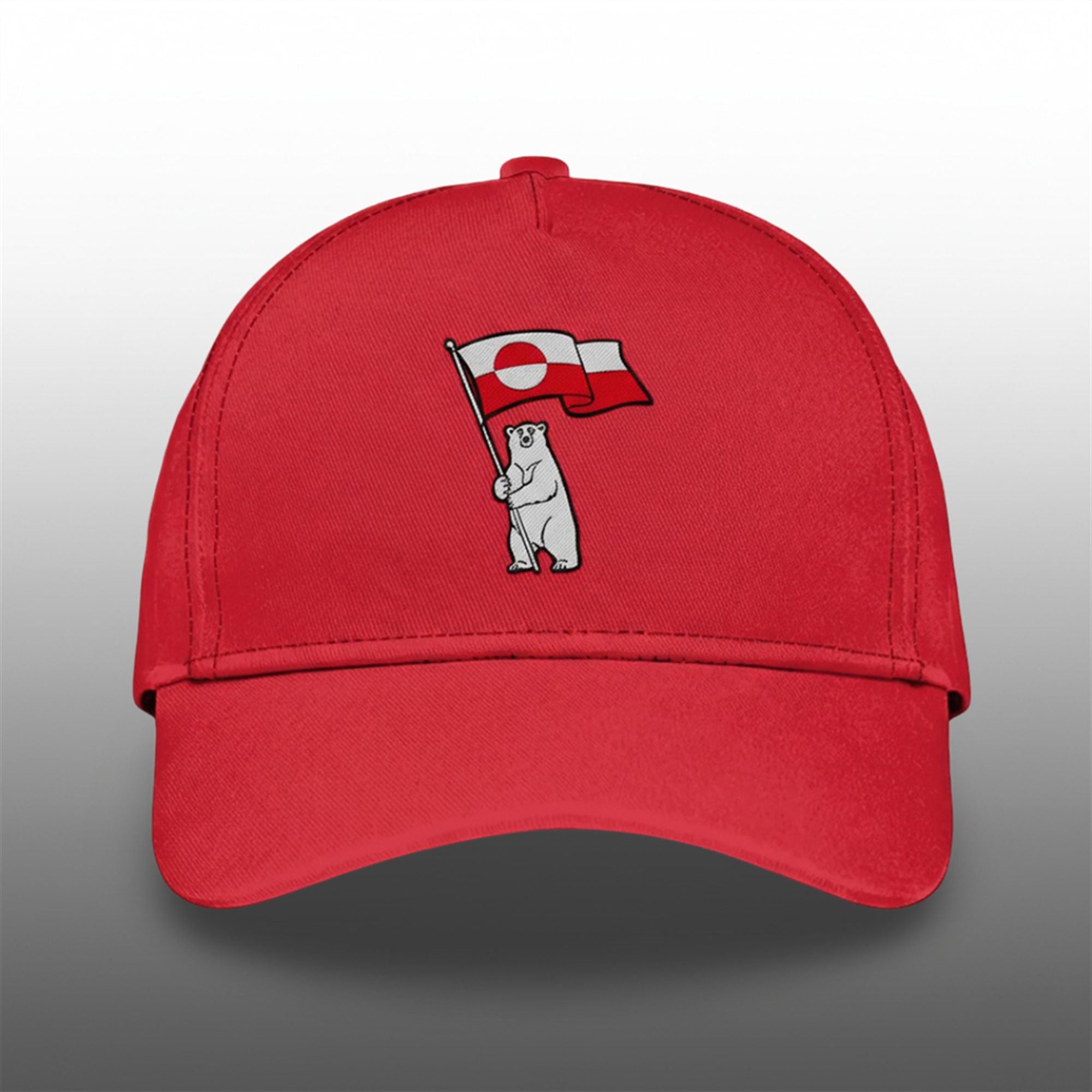 The hat is a masterclass in visual storytelling. At first glance, it appears to be a classic red souvenir cap, but the context behind the design adds layers of meaning. The central figure—a standing polar bear—serves as the guardian of the North, firmly planting the red and white flag of Greenland. This imagery represents autonomy, resilience, and the unique identity of the world’s largest island.