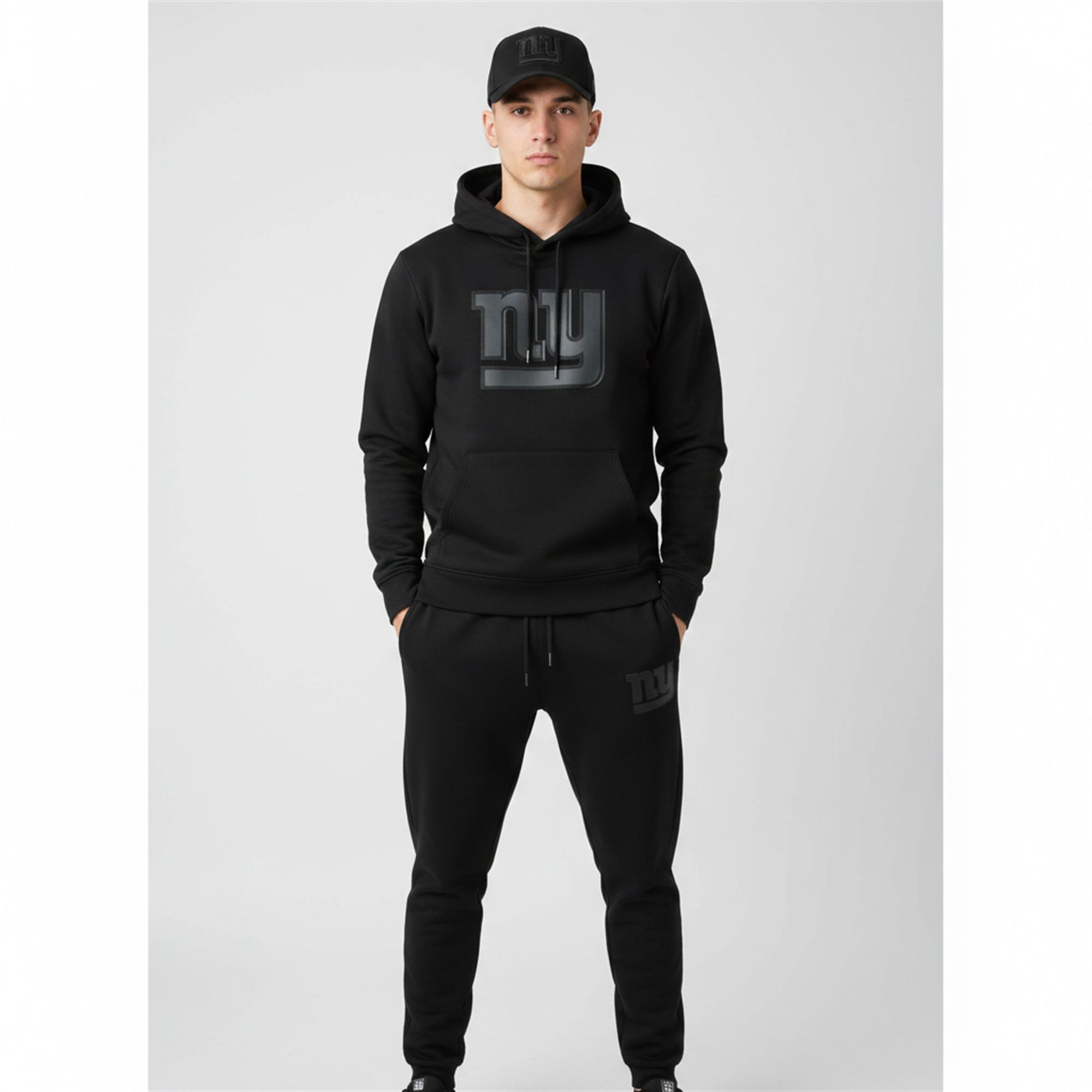 This bundle captures that ethos perfectly. The centerpiece is the pullover hoodie, featuring the iconic “ny” logo in a subtle, gunmetal grey finish on the chest. The back of the hoodie makes a bolder declaration with “NEW YORK GIANTS FOOTBALL” emblazoned in a distressed, industrial font, paying homage to the city’s toughness. Paired with matching slim-fit joggers and a coordinate baseball cap, this set offers a cohesive, head-to-toe look that is unmatched in the market.
