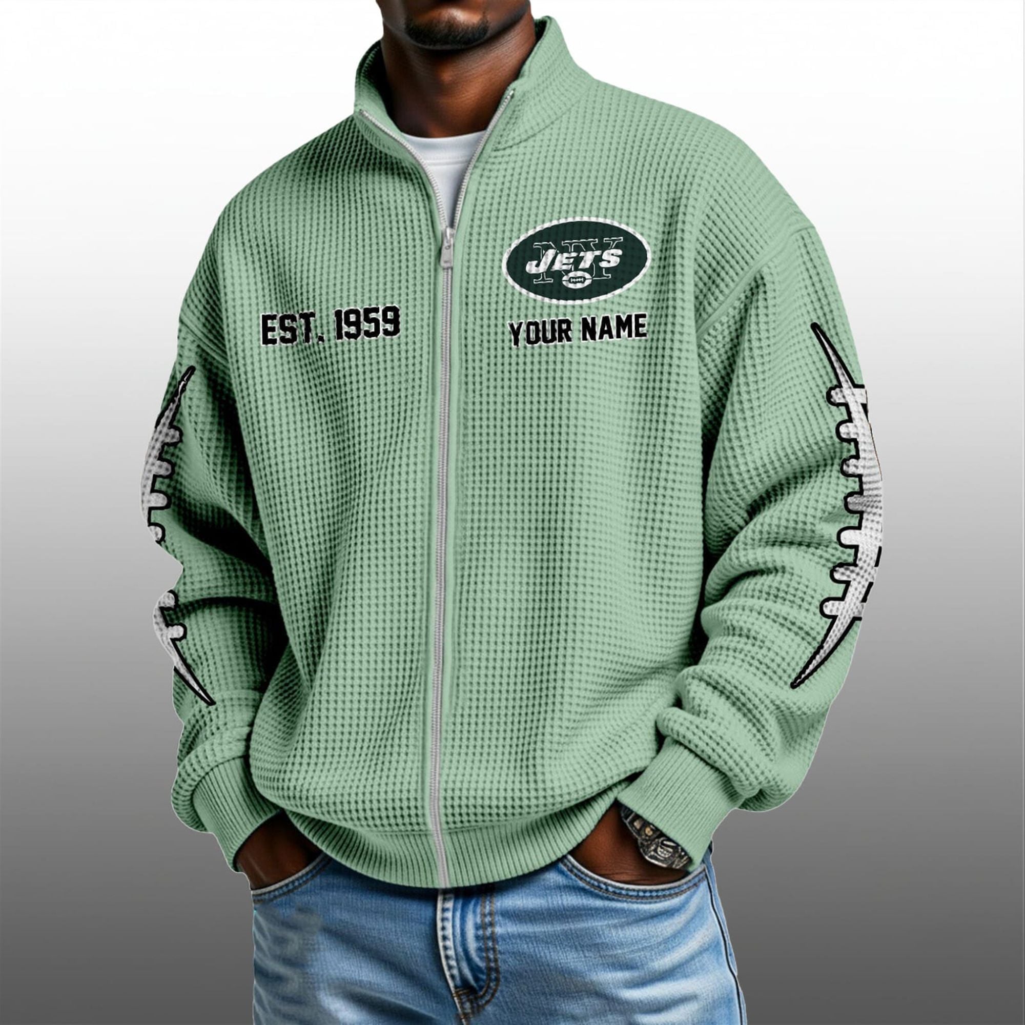 This specific design exploded across social platforms because it cracked the code of “Soft Fandom”—a major trend in 2026 where aggressive sports imagery meets soft, approachable color palettes. Influencers loved the juxtaposition of the rugged football sleeve graphics against the calming lavender tone, creating a “visually satisfying” contrast that pops on video feeds. Secure your personalized piece today and redefine what it looks like to be a Jets fan in 2026.