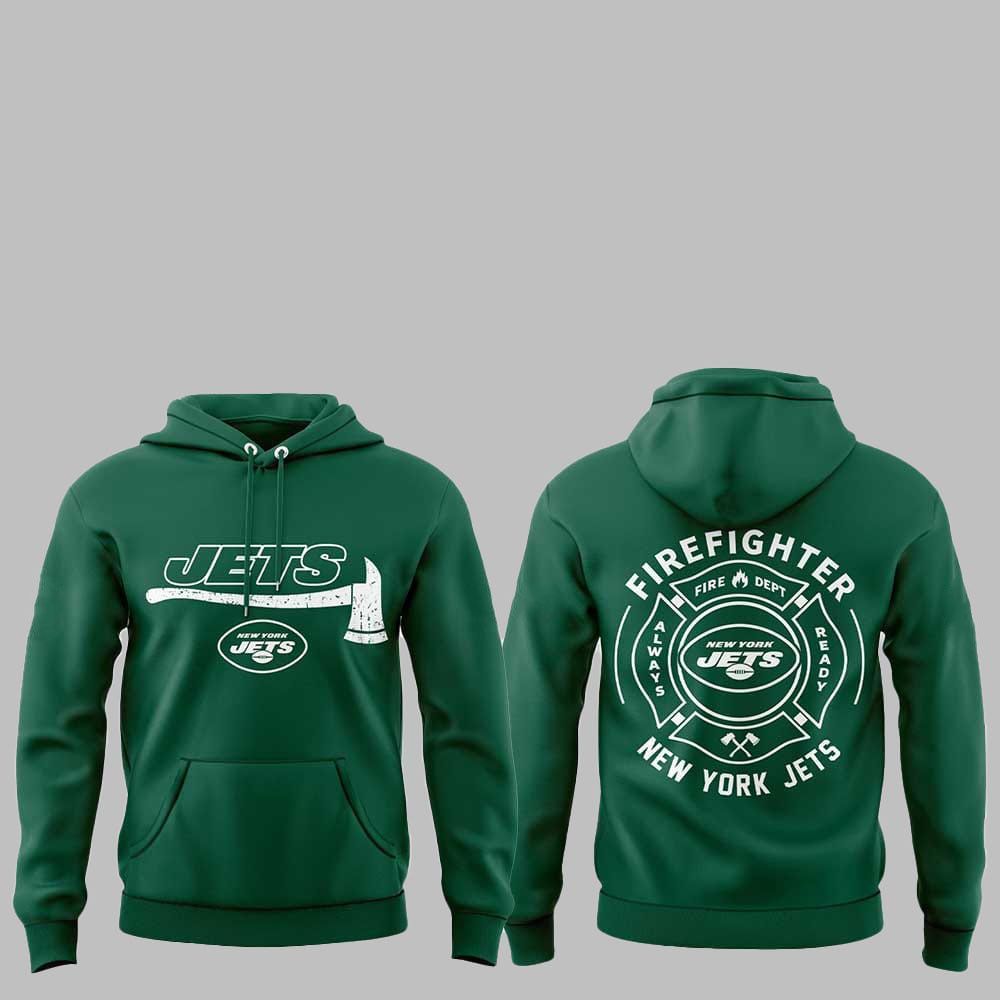The true heart of this tribute lies on the back. Encased in a powerful circular emblem are the words “FIREFIGHTER DEPT” and the motto “ALWAYS READY,” a testament to the constant vigilance of these first responders. At the center of this emblem, the Jets logo is showcased, creating a seamless fusion of two respected institutions. The design is completed with “NEW YORK JETS” text and crossed axes, signifying brotherhood and courage. This t-shirt is for the dedicated fan, the active or retired firefighter, their families, and anyone who wishes to publicly display their support for the heroes who walk among us. It’s an ideal piece to wear on game day, to the firehouse, or during the Firefighter Application Day events in 2025.