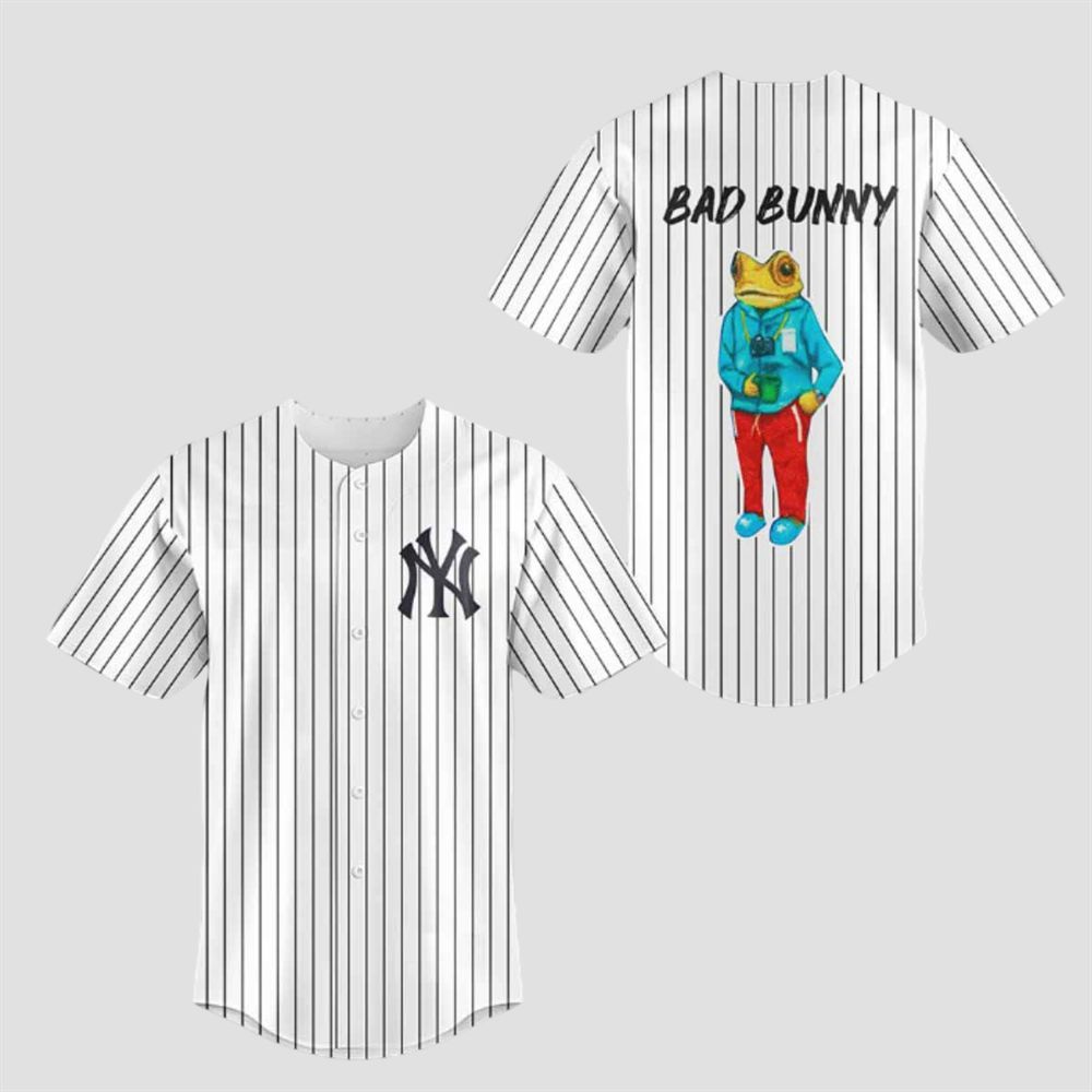 This is more than a jersey; it’s a cultural artifact. The NY Yankees x Bad Bunny 2025 Jersey is a masterclass in collaboration, blending the stoic, legendary legacy of New York baseball with the vibrant, revolutionary world of Bad Bunny. The front proudly displays the universally recognized, interlocking “NY” logo, a symbol of athletic excellence and history. But the true story unfolds on the back. Anchored by the bold “BAD BUNNY” lettering, an exclusive, full-color graphic of Benito’s iconic frog character—decked out in stylish streetwear with a camera in hand—captures the artist’s unique blend of confidence, creativity, and cool.