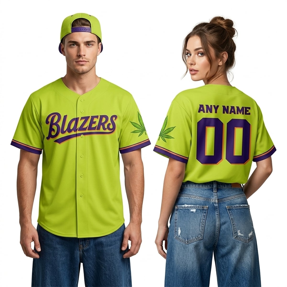 The jersey is a brilliantly executed parody piece that completely reimagines traditional sports aesthetics. The visual profile is unapologetically loud, featuring a vibrant, eye-catching lime green base that demands attention. Across the chest, the word “Blazers” is written in a nostalgic, flowing purple script with an energetic orange drop shadow.