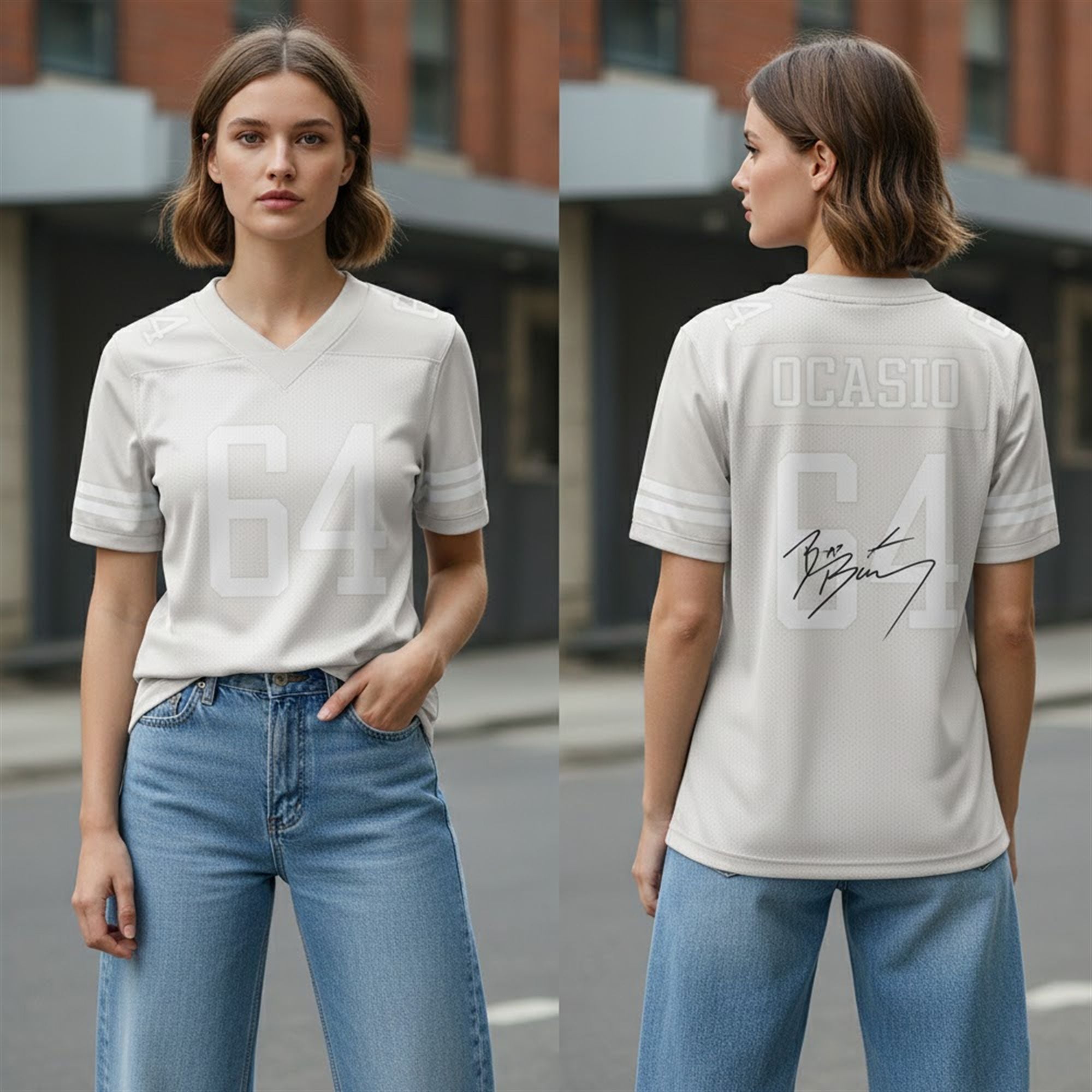 The front displays a bold, minimalist number 64, while the back carries the “OCASIO” nameplate—a declaration of self-made success. The signature of Bad Bunny is emblazoned across the number, adding a layer of authenticity to the design. This jersey is designed to be styled effortlessly, whether layered over a collared shirt and tie for the full “Benito” runway look or worn loose with cargo pants for an everyday street style flex.