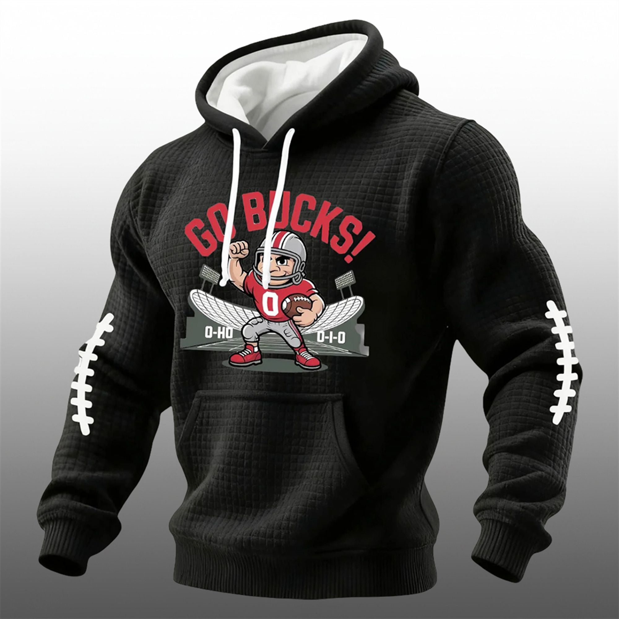The hoodie is a visually immersive tribute to one of college football’s most storied programs. The centerpiece of the design is a high-energy illustration of the Buckeyes‘ mascot, donning a number 0 jersey and striking a power pose against a stylized stadium background. The graphic cleverly integrates the iconic “O-H” and “I-O” chant into the sideline barriers, instantly connecting with fellow fans who know the call and response.