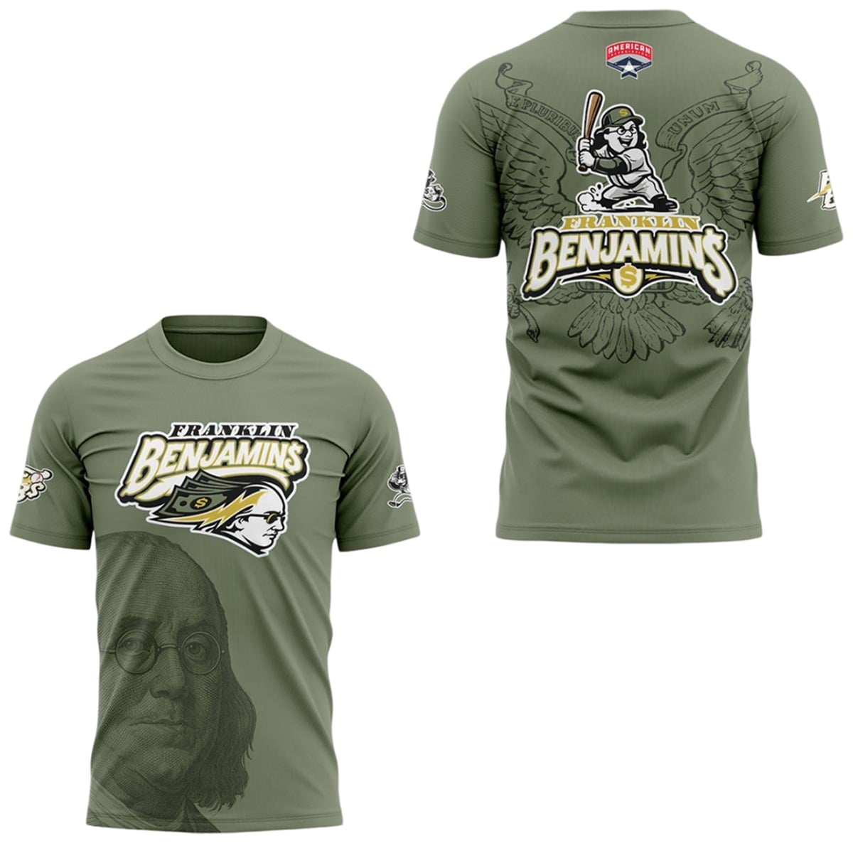 This design is an absolute masterclass in visual storytelling and conceptual blending. Grounded in a military-inspired olive drab hue, it nods respectfully to the beloved “Salute to Service” aesthetic that dominates modern sports culture. The front of the garment is instantly arresting, featuring a large, classic portrait of founding father Benjamin Franklin. This historical gravitas is immediately contrasted by the aggressive, stylized “Franklin Benjamins” wordmark and a secondary logo depicting Franklin wearing modern sunglasses, integrating a dollar sign into the typography.